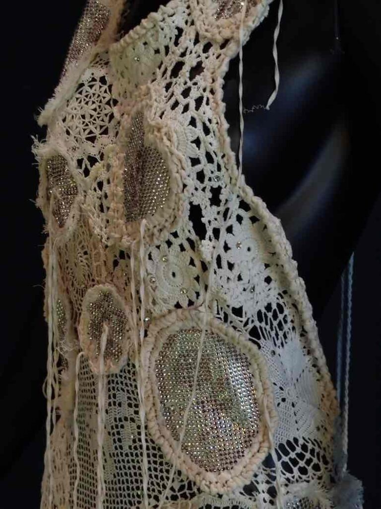 Un peu plus loin, la Danoise Katrine Ravndal présente le look 07, une somptueuse robe de mariée conçue à partir de rideaux et de draps recyclés, symbole d’un romantisme repensé et littéralement recyclé. À ses côtés, la Française Géraldine Barros détourne d’anciens drapeaux européens pour créer une pièce engagée, portant un message fort sur la citoyenneté et le vote. Mais les créatrices baltes et ibériques ne sont pas en reste : la Lituanienne Reda Paula, avec le look 17, réinvente des napperons traditionnels en un ensemble contemporain mêlant mémoire et modernité, tandis que le Portugais Béhen, pour le look 22, transforme une nappe en dentelle ancienne en une robe d’exception.