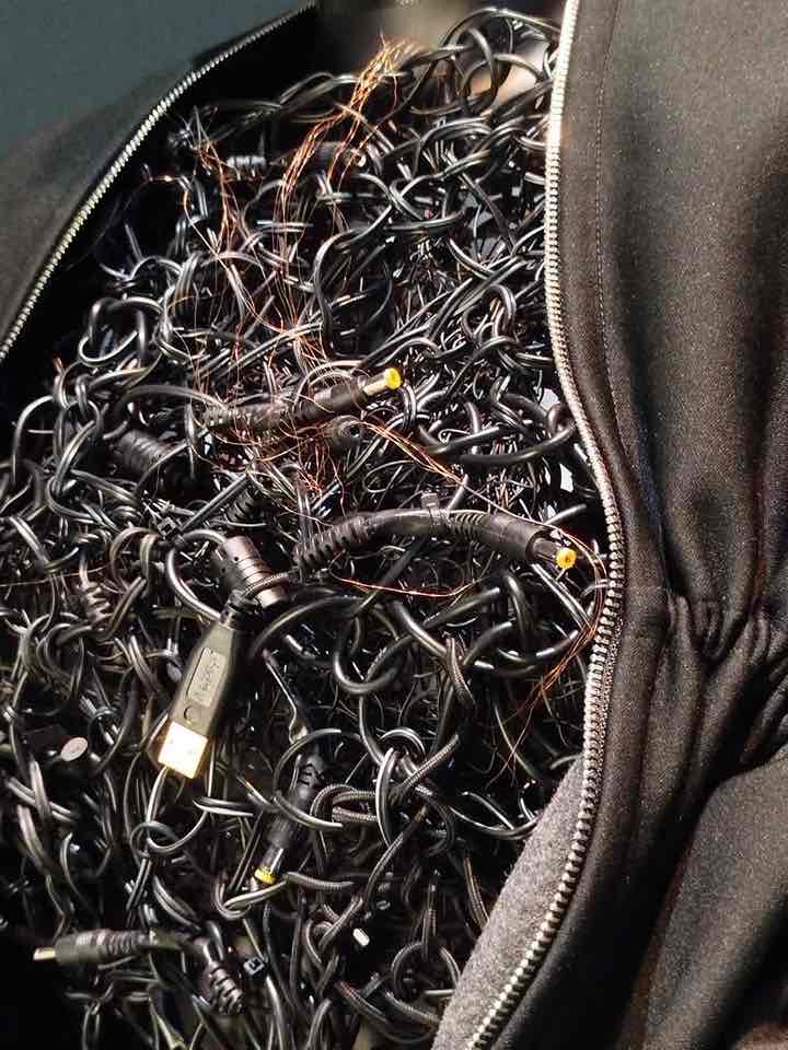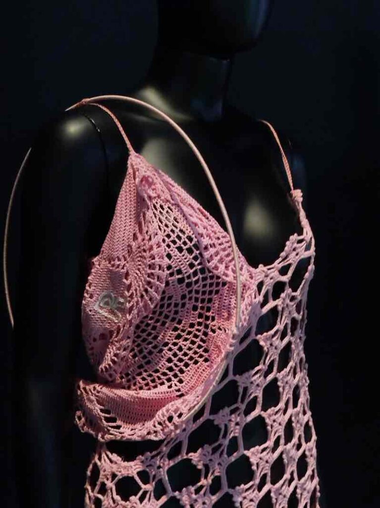 Le look 04 du Bulgare Nikolay Bozhilov repose sur une technique de découpe sans chute de tissu, une prouesse de couture zéro déchet à laquelle s’ajoute une robe tricotée à partir de câbles USB, transformant l’outil numérique en matière textile. Le créateur chypriote Michalis Pantelidis propose quant à lui, pour le look 05, un caftan en polyester recyclé orné de photographies de décharges à ciel ouvert qu’il transforme en un motif kaléidoscopique coloré.