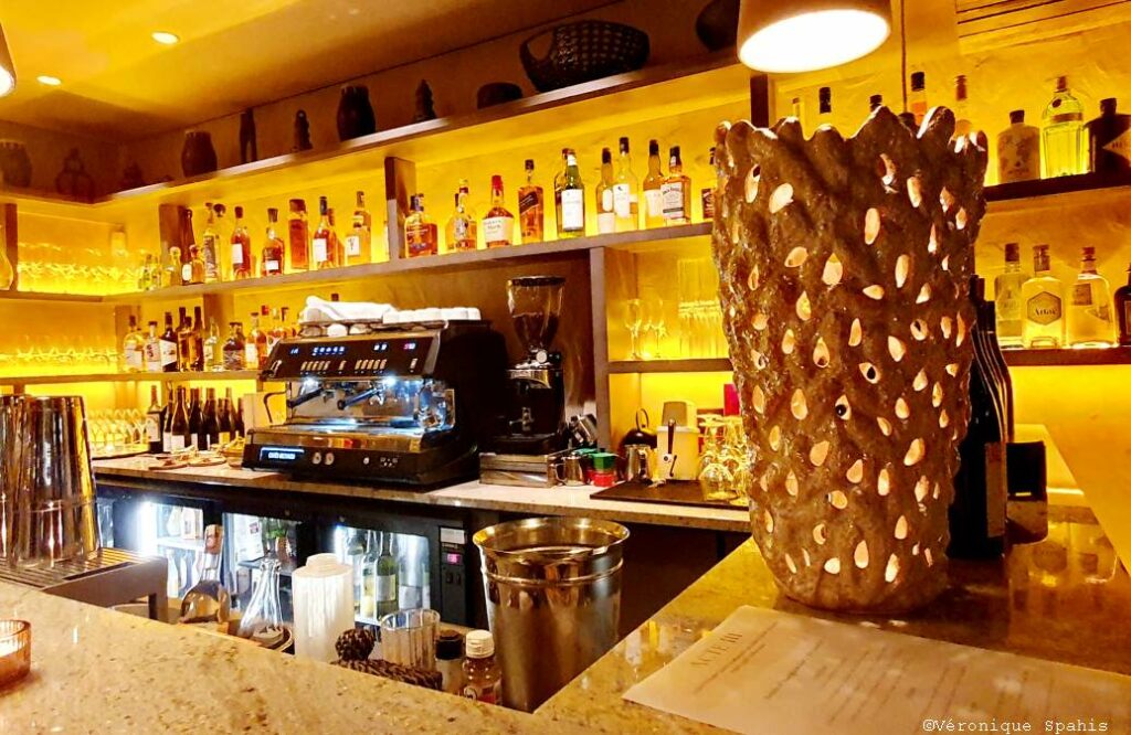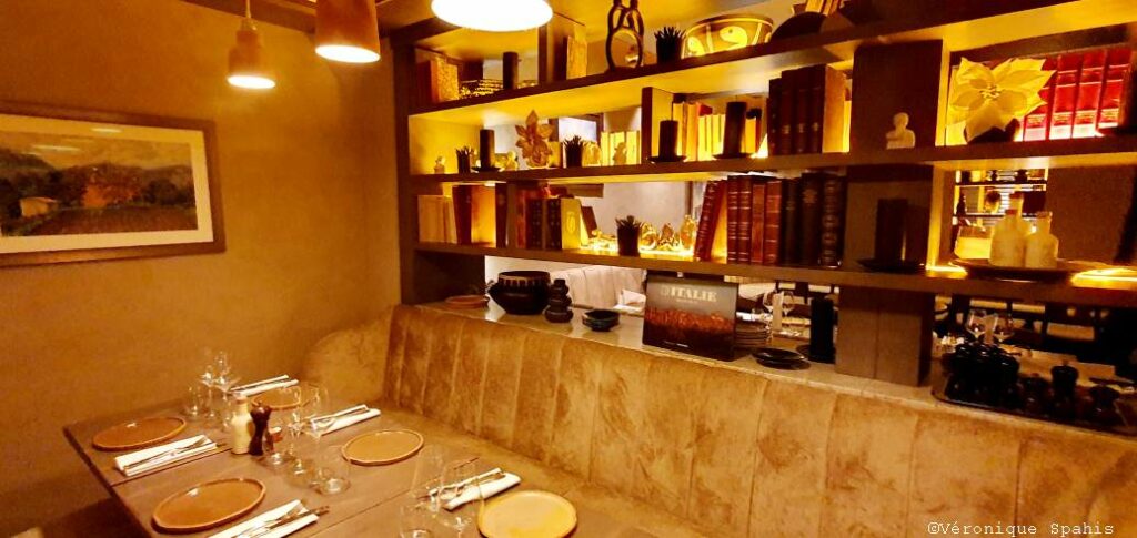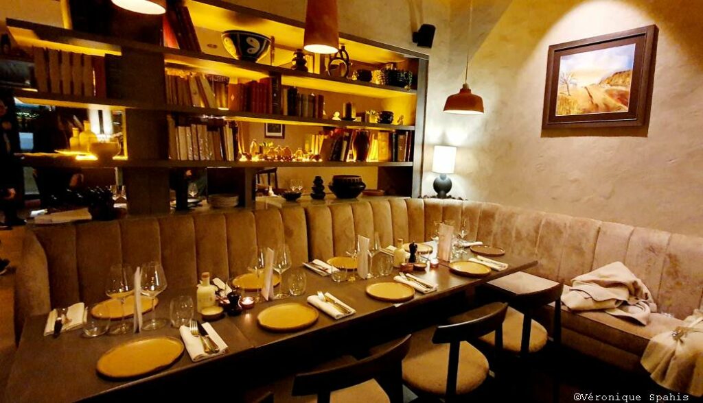 Rien n’est laissé au hasard. Chaque table repose sur un piètement unique, dessiné sur mesure. Les assiettes de présentation, façonnées par une céramiste du Sud-Ouest, rappellent l’importance de l’artisanat. Des livres anciens, quelques objets choisis et une décoration subtilement patinée créent une atmosphère rassurante, presque domestique.