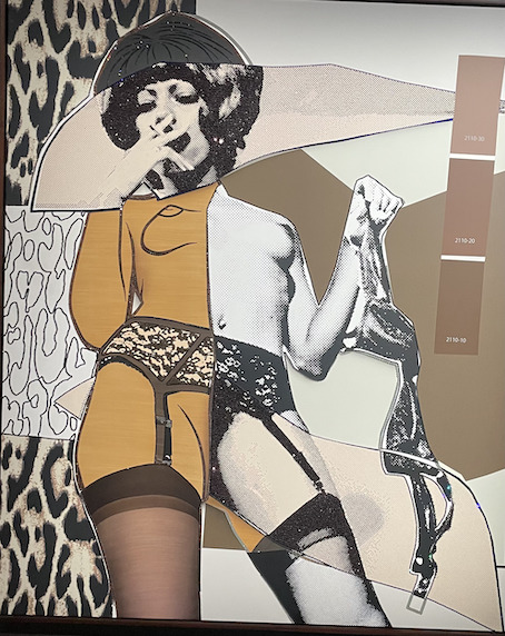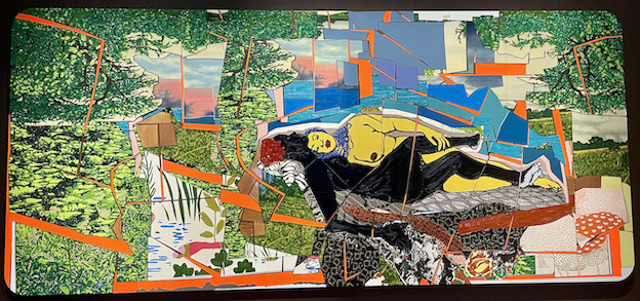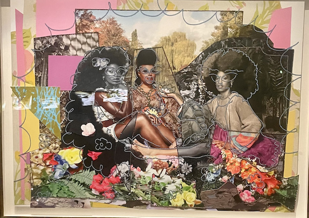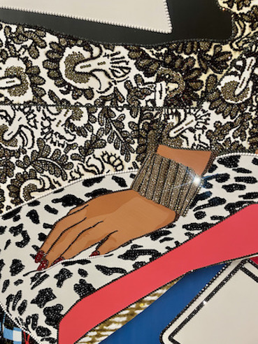 Mickalene Thomas s’inscrit dans une longue tradition du portrait, qu’elle détourne et réinvente. Elle dialogue avec l’histoire de l’art européen – et en particulier français – en réinterprétant des chefs-d’œuvre canoniques tels que Le Déjeuner sur l’herbe de Manet ou La Grande Odalisque d’Ingres. Là où les femmes étaient autrefois objets de regard, façonnées par le peintre, Michalene Thomas les replace au centre du récit, souveraines, conscientes de leur pouvoir et maîtresses de leur image. Ses compositions luxuriantes, souvent incrustées de strass, convoquent autant le glamour que la critique sociale. La surface scintillante, loin d’être décorative, agit comme un manifeste : elle attire le regard pour mieux questionner les normes de beauté eurocentriques et affirmer une esthétique noire, assumée, désirable et puissante.