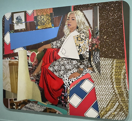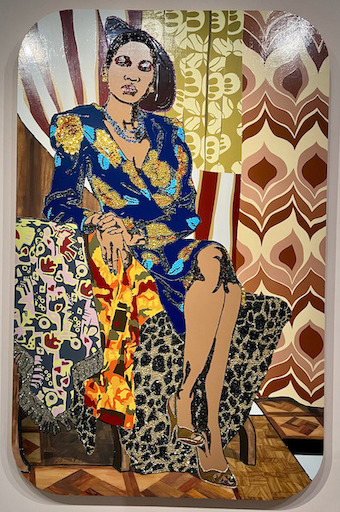 Au cœur de l’exposition, une section est consacrée aux « Déesses noires », figures centrales de l’univers de Mickalene Thomas. L’artiste travaille presque exclusivement avec des femmes issues de son cercle intime, qu’elle appelle ses muses. Ces collaborations s’inscrivent dans la durée, nourries par la confiance, l’admiration et une profonde connexion à leur propre beauté. Le processus créatif commence par des séances photographiquesréalisées dans des décors domestiquesconstruits sur mesure dans son studio de Brooklyn. Ces images deviennent ensuite la base de grandes peintures mêlant huile, acrylique, émail et strass multicolores – une signature devenue emblématique. L’autoportrait occupe également une place centrale, comme dans Afro Goddess Looking Forward, où l’artiste se met elle-même en scène, affirmant son identité et son autorité créative.