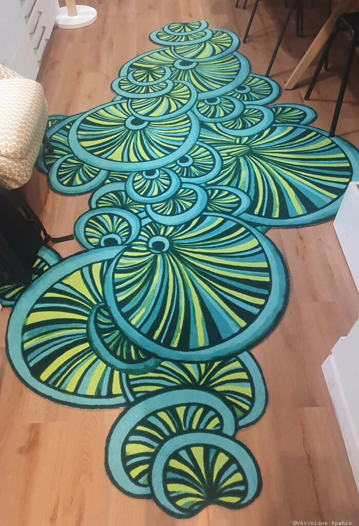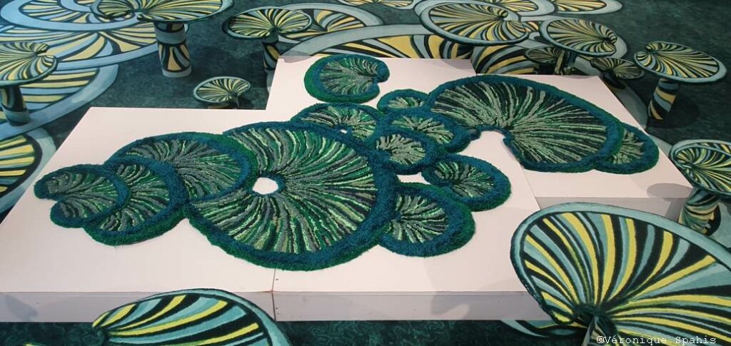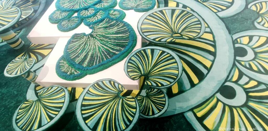 Le choix du terme aquaponie n’est pas anodin. Il désigne un système écologique où plantes et organismes aquatiques s’équilibrent dans un cycle vertueux. Dans le showroom Balsan, cette logique se traduit par une scénographie où textures, couleurs et reliefs rappellent l’interdépendance des éléments : La moquette déploie un motif récurrent de formes circulaires rappelant des feuilles de nénuphar stylisées, déclinées en plusieurs tailles. Ces cercles concentriques aux verts et jaunes vibrants suggèrent un étang imaginaire, un plan d’eau proliférant sous nos pas. Le sol, par essence modulaire et technique, devient ici surface d’interconnexions et paysage aquatique.