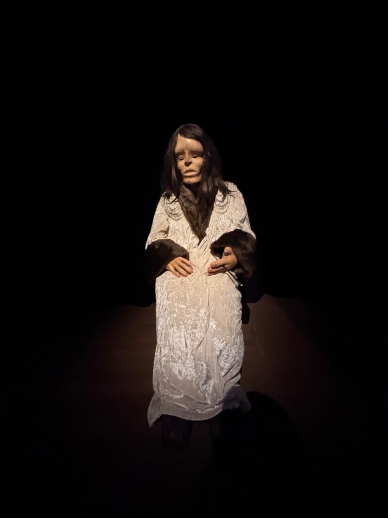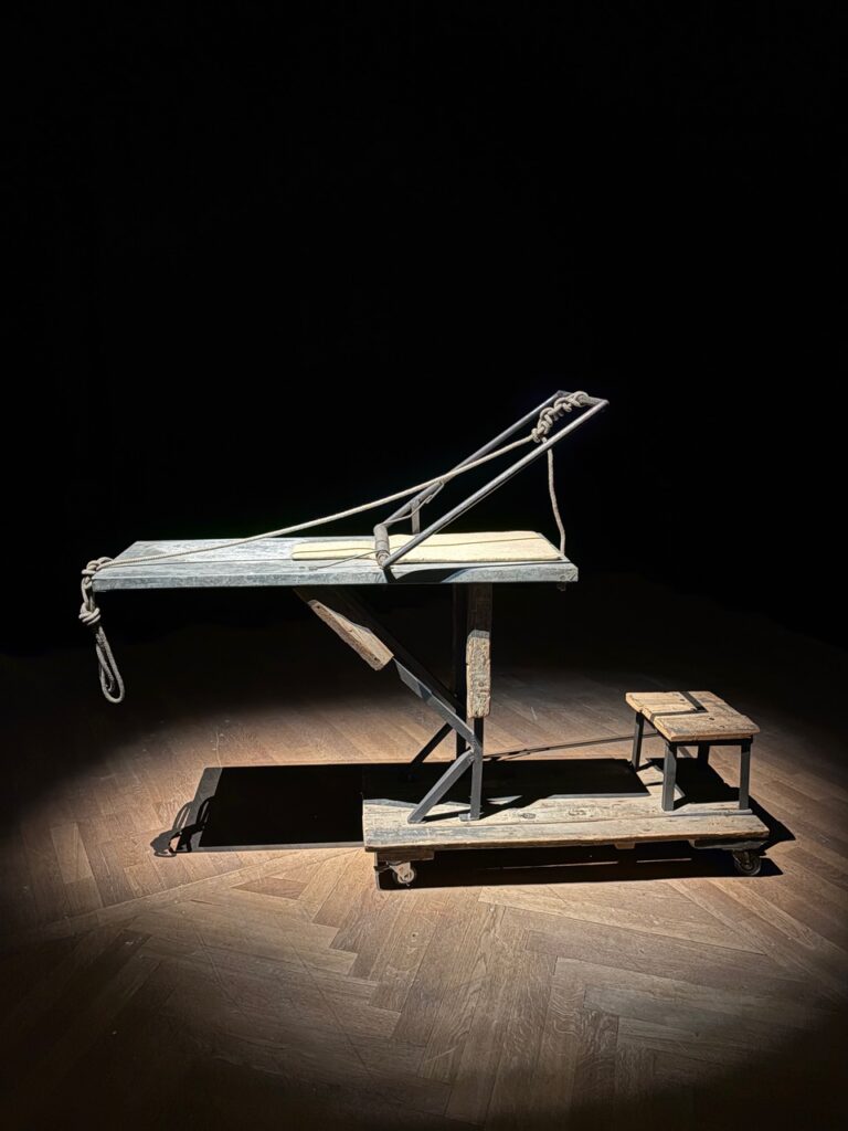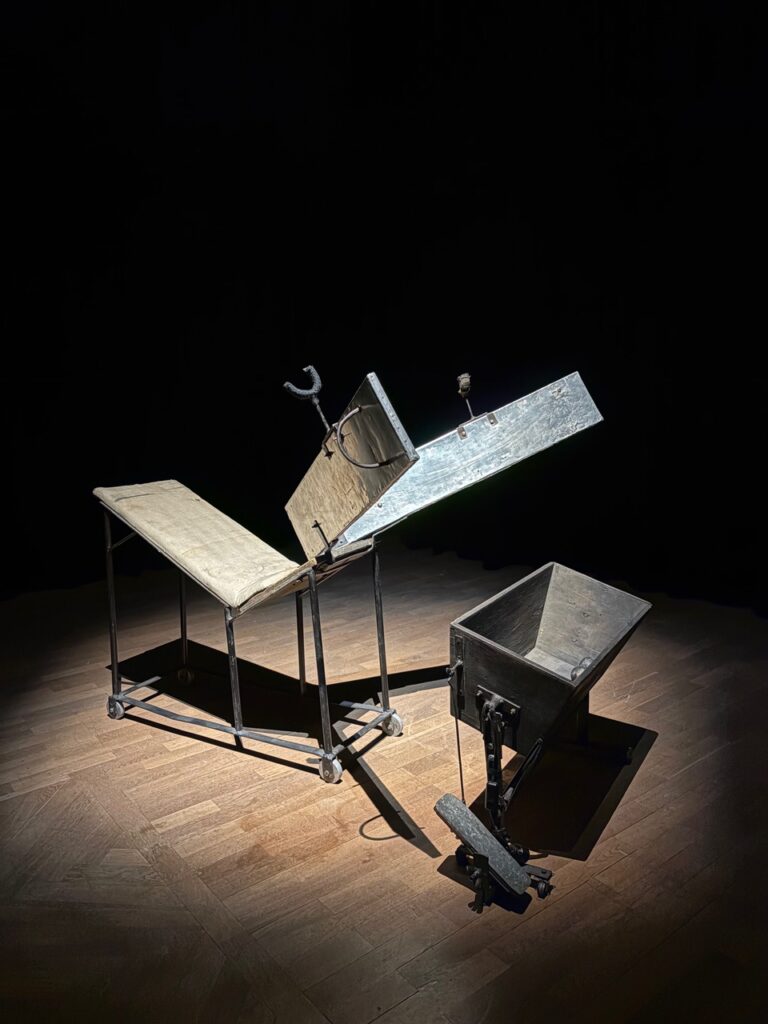 Machines absurdes et sinistres à la fois, elles réduisent l’acteur à un corps manipulé, soumis aux dispositifs comme Artaud imaginait des objets « chargés », davantage talismans que simples accessoires. Dans la même veine, les peintures de Liza Lacroix, sombres et blessées, apparaissent comme des actes plus que des images : gestes possédés, convulsions lumineuses qui prolongent la tradition du clair-obscur pour en détourner la solennité. La jambe mécanisée de Tobias Bradford, oscillant sans progression possible, met en scène l’absurdité d’un corps condamné à tourner à vide ; une image brute d’un théâtre sans résolution, tel que le théoricien français l’avait imaginé. Les poupées de Michel Nedjar, couvertes de sang, de tissu et de boue, condensent les logiques de deuil et de mémoire dans des effigies rituelles qui évoquent, selon la commissaire, « des armes de magie sacrée ».