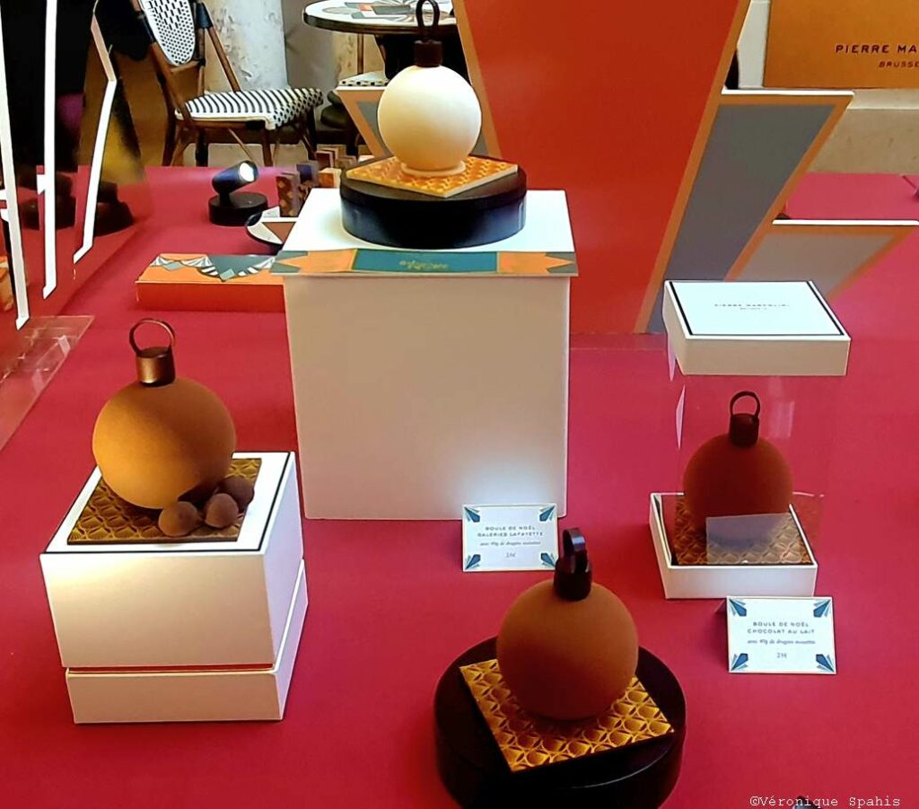 Des pièces festives à suspendre ou à offrir : Boule de Noël garnie, coffrets sapins, gourmandises individuelles… toujours avec cette esthétique sobre et stylisée.