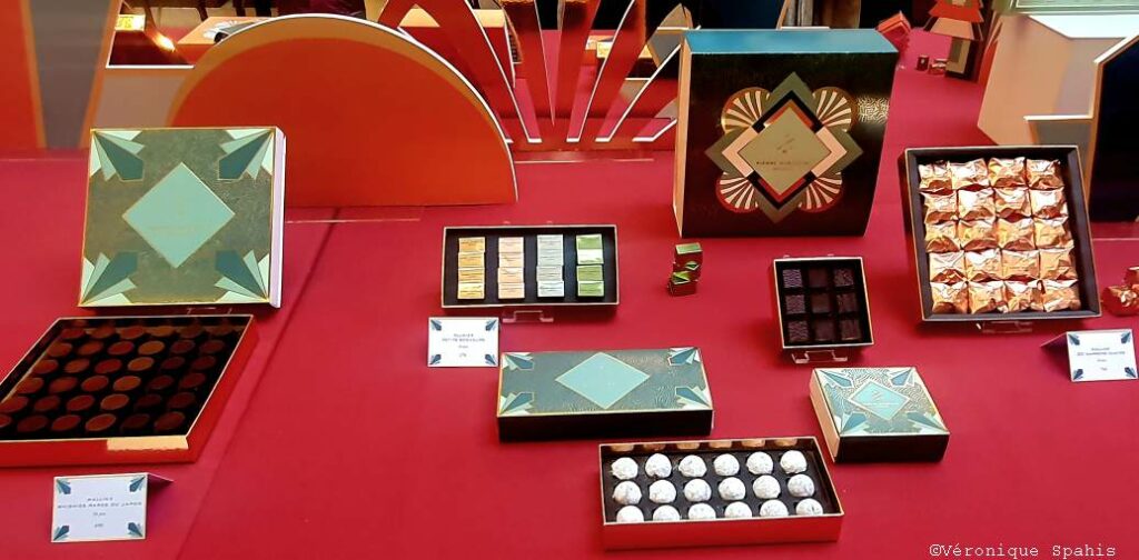 Des coffrets de truffes et pralinés : Pensés comme de véritables objets décoratifs, ils associent illustrations géométriques, couleurs profondes et finitions dorées. À l’intérieur, les recettes signatures de la Maison — ganaches pures, pralinés fondants, truffes parfumées — se déclinent dans une ambiance festive.