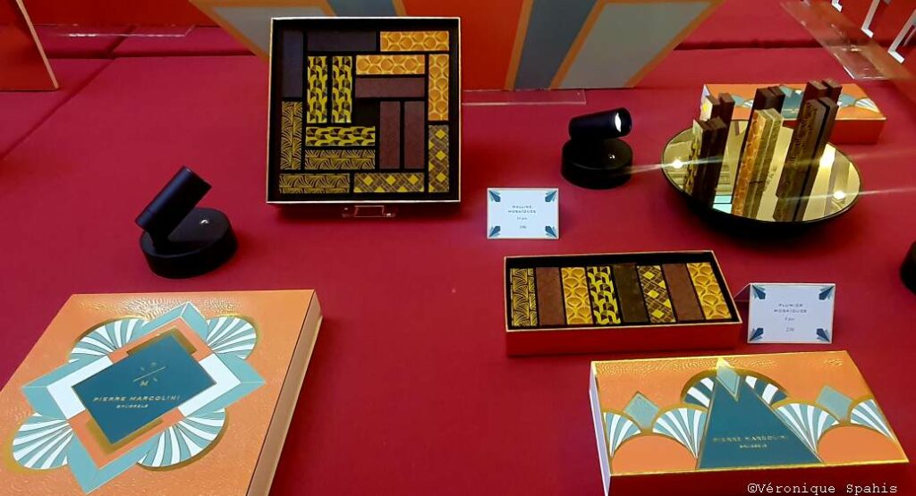 Pierre Marcolini ne se contente pas d’habiller ses chocolats d’un décor rétro : l’esprit Art Déco infuse toute la création, de la conception des moules aux associations aromatiques.