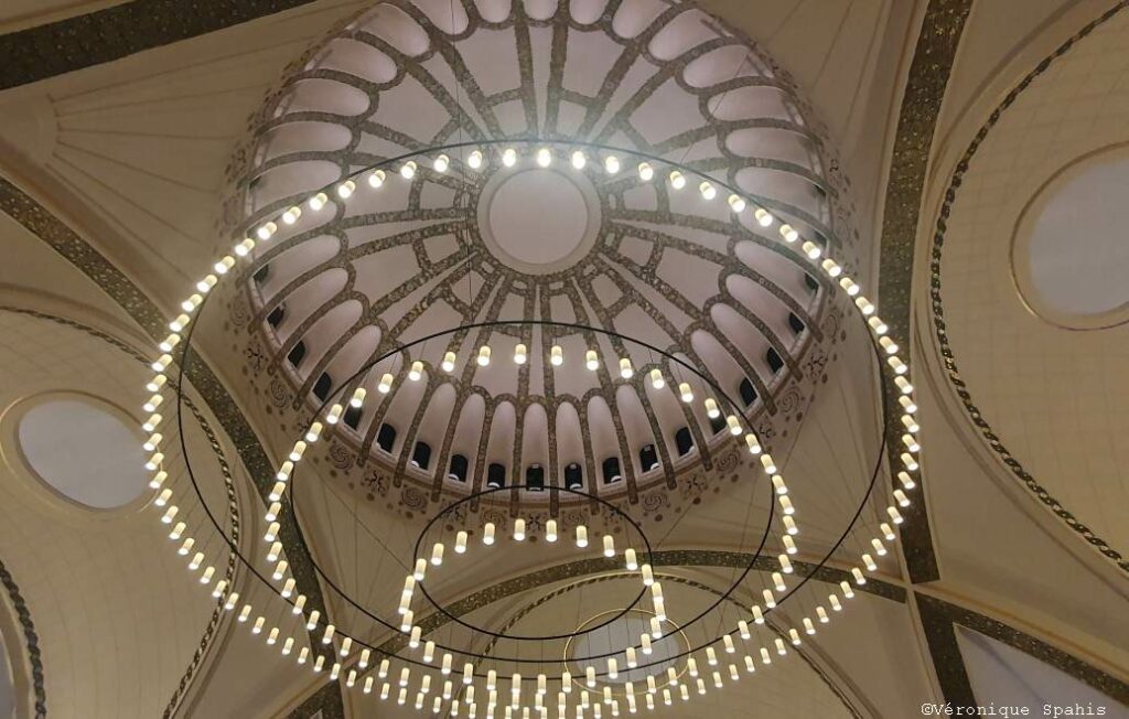 L’architecture du Palais est un hymne à la clarté. Ses dômes majestueux, qui ponctuent la ligne d’horizon évianaise, surmontent un hall d’entrée grandiose où le temps semble s’être cristallisé. Mais c’est en levant les yeux que l’on saisit toute la magie du lieu : l’immense verrière zénithale et les vitraux aux motifs floraux baignent les visiteurs dans une lumière dorée, presque liquide. C’est cette même clarté, douce et enveloppante, qui accueillait autrefois les curistes. On les imagine, vêtus de lin blanc, déambulant entre les cabines de soins et les salons de repos, portés par cette promesse de régénération que seule l’eau d’Évian savait offrir.