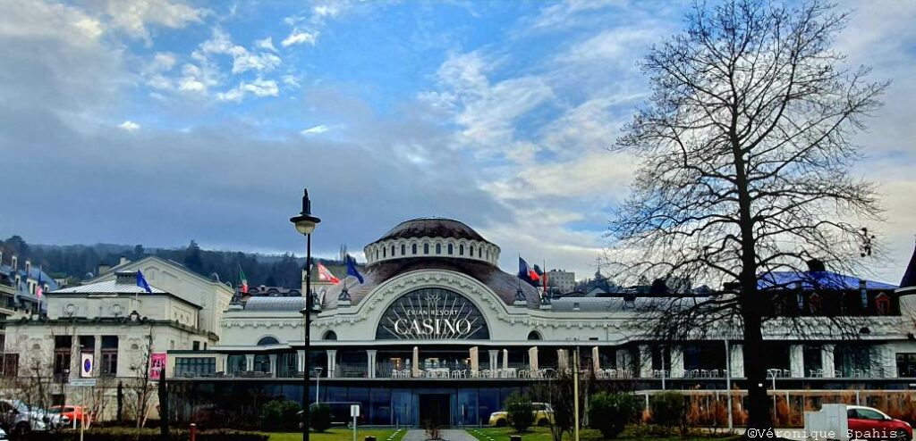 La promenade se poursuit au rythme des flots, là où le quai s’élargit pour laisser place au faste nocturne. Le Casino d’Évian, avec son architecture circulaire audacieuse surmontée d’un dôme majestueux, s’impose comme une sentinelle du divertissement. Construit sur l’emplacement d’un ancien château, il rappelle que la nuit évianaise a toujours eu le goût du risque et du glamour.