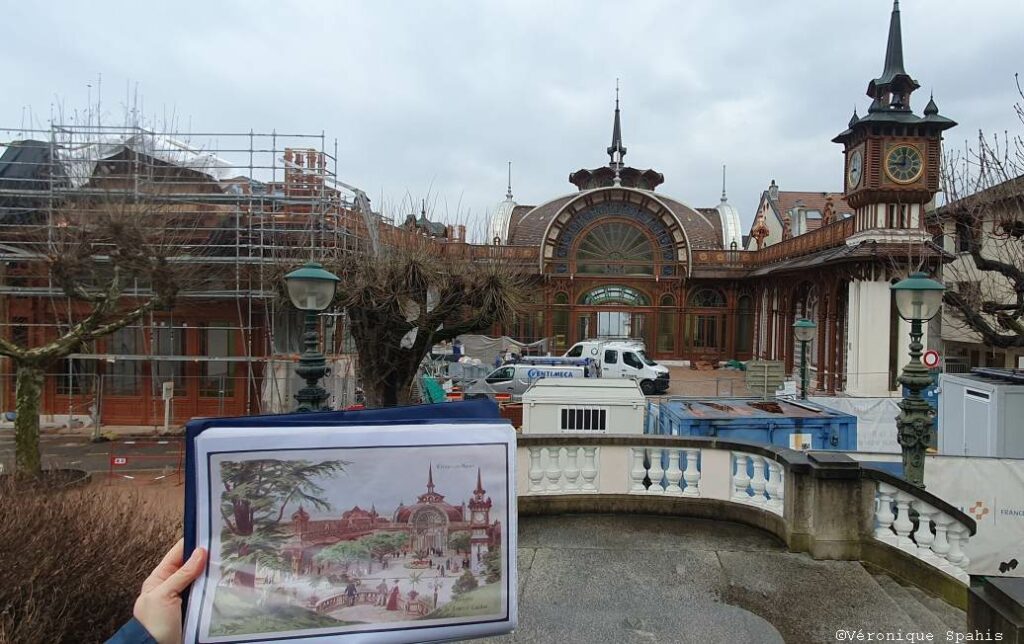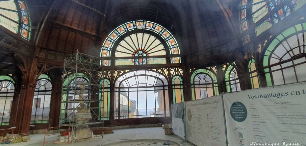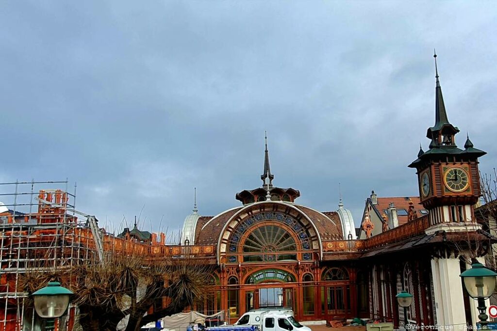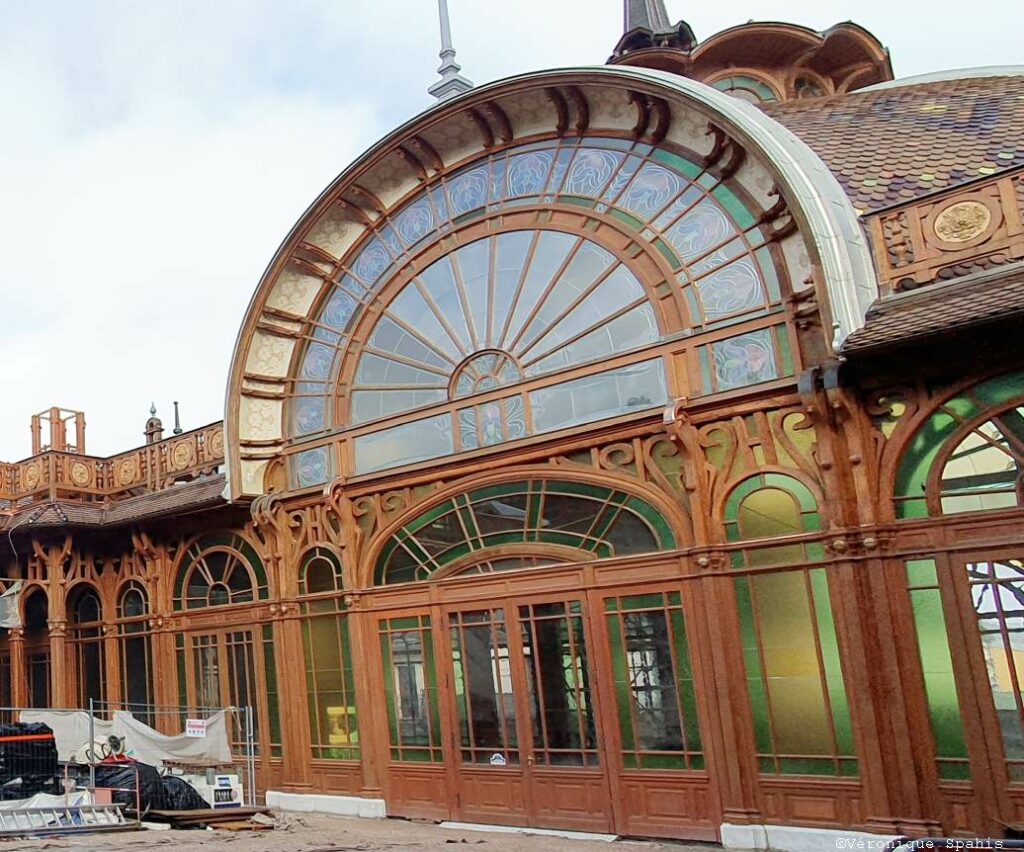 Juste en face, tel un géant endormi, la Buvette Cachat panse actuellement ses plaies derrière ses échafaudages. Ce chef-d’œuvre absolu de l’Art nouveau, érigé en 1903 par l’architecte Albert Hébrard, est une cathédrale de lumière dédiée à la santé. Sa charpente aérienne en bois de chêne, véritable prouesse technique, dessine des courbes organiques qui rappellent le mouvement des vagues ou les nervures d’une feuille.