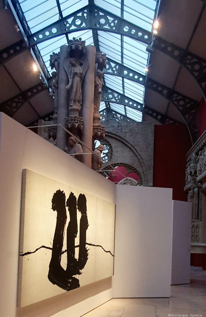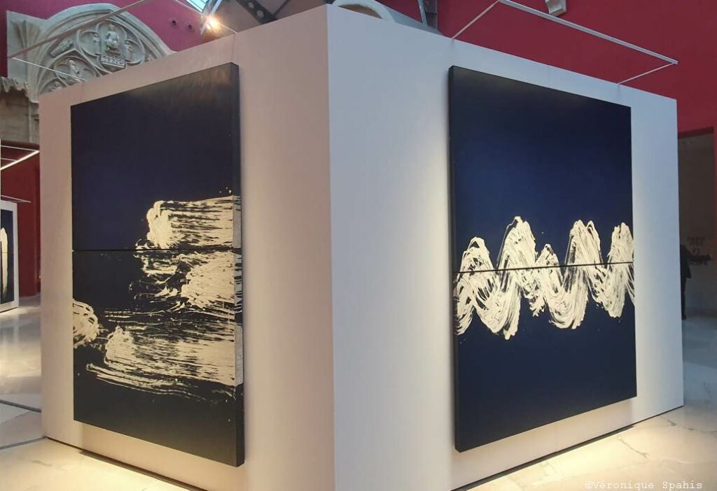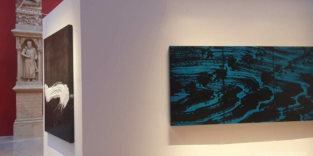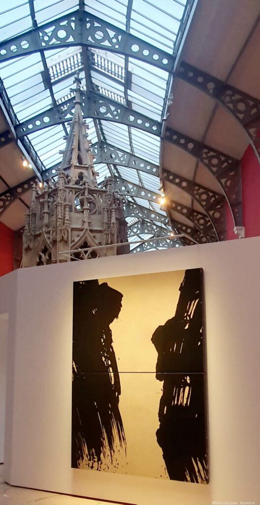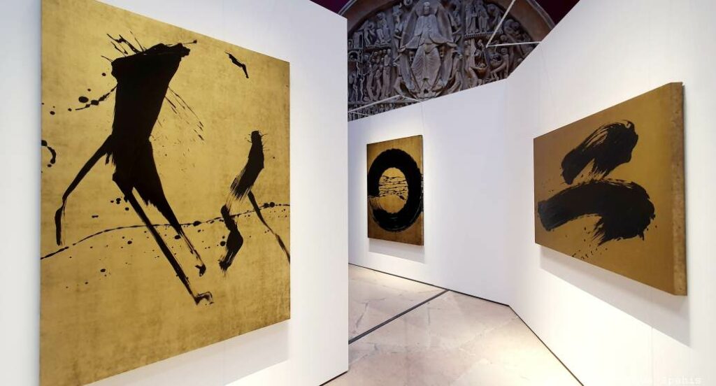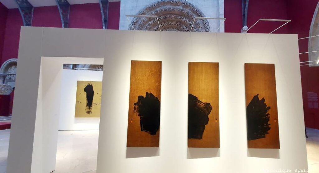 Les verticales des portails gothiques répondent aux lignes de gravité du pinceau ; les volumes massifs amplifient la légèreté du trait ; la couleur devient lumière au cœur de cet espace habité par les ombres et les reflets. Le visiteur circule dans un dialogue permanent entre l’histoire et le présent, le visible et l’invisible.