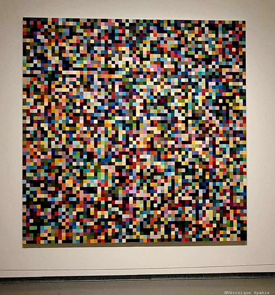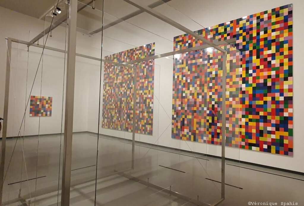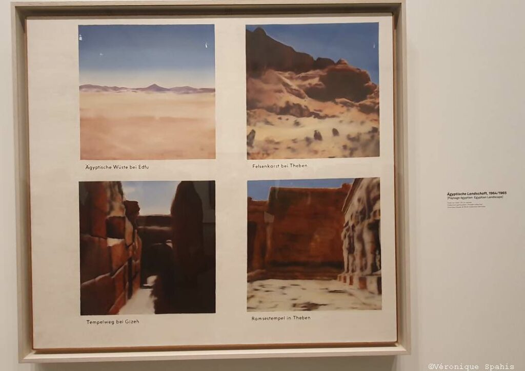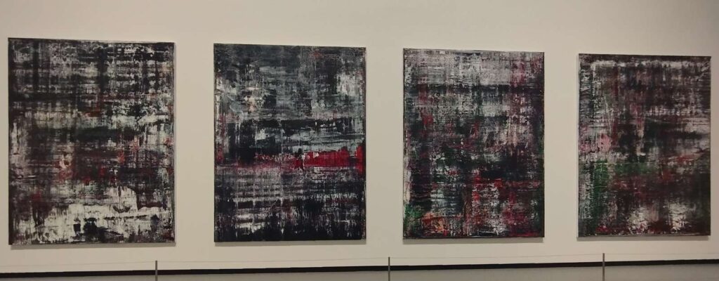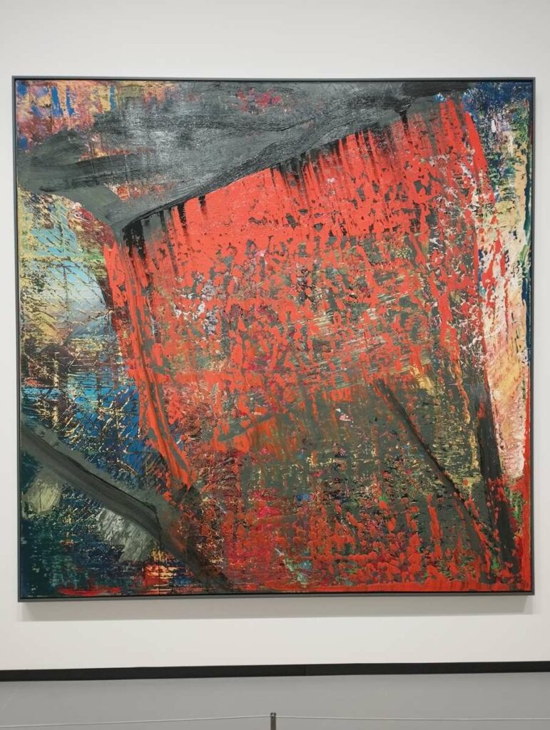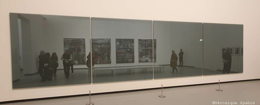 Des photo-peintures aux tableaux abstraits en passant par les dessins au crayon et à l’encre, les aquarelles, les miroirs, les verres, les monochromes gris, les représentations à thème historique et politique et les portraits les plus intimes, la reproduction des grands chefs-d’œuvre (avec le chef-d’œuvre de la leçon veermerienne Lesende de 1994, et les six versions du Verkunndigung nach Tizian, 1973), l’immense exposition s’étale sur les quatre étages de la Fondation, chacun regroupant entre dix et quinze ans de production.