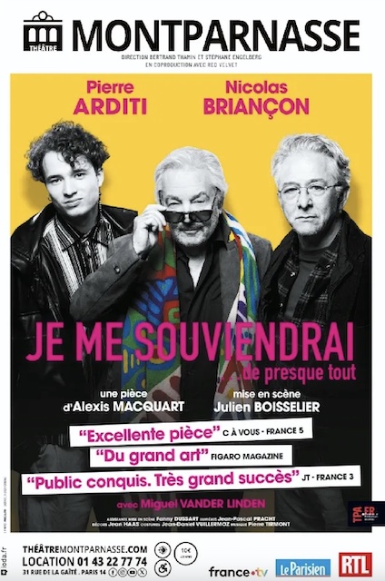 « Je me souviendrai de presque tout » est une nouvelle pièce d’Alexis Macquart, écrite sur mesure pour Pierre Arditi et Nicolas Briançon. Sur scène, trois hommes, trois générations : un grand- père, un père et un fils.