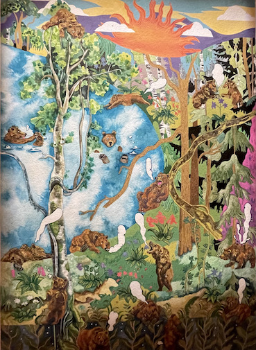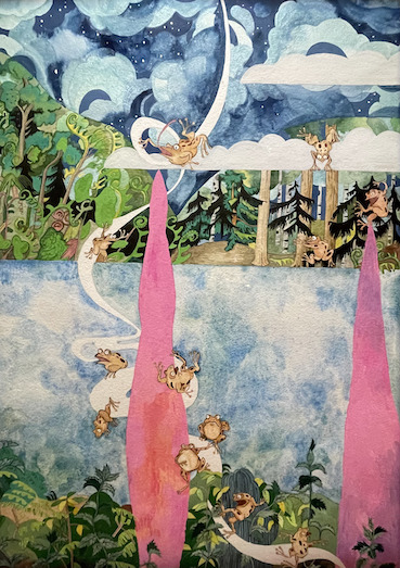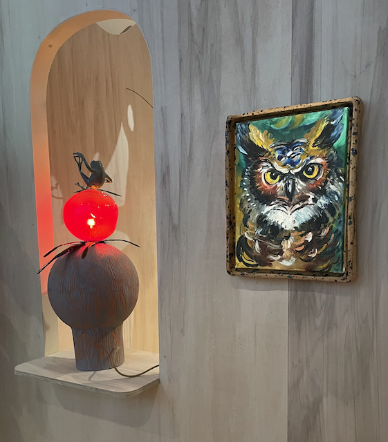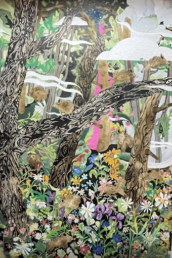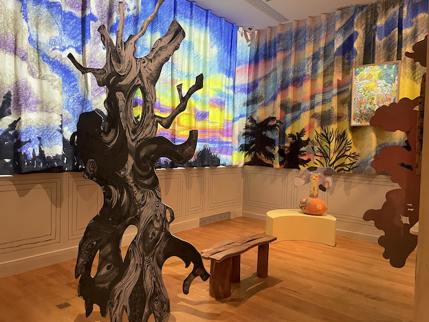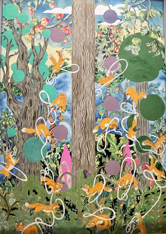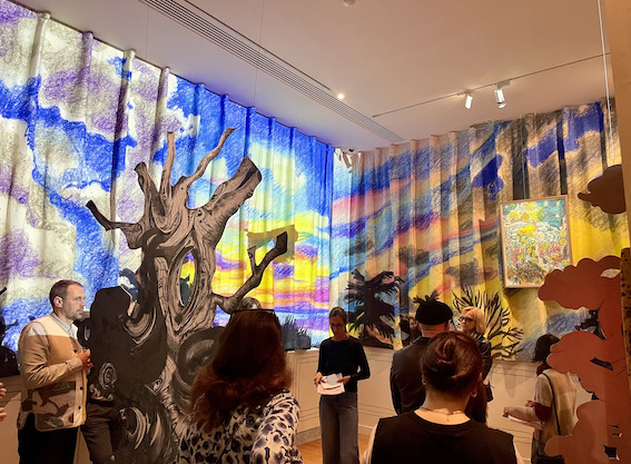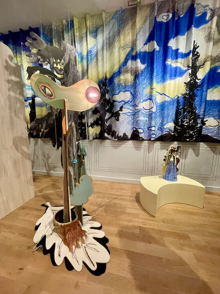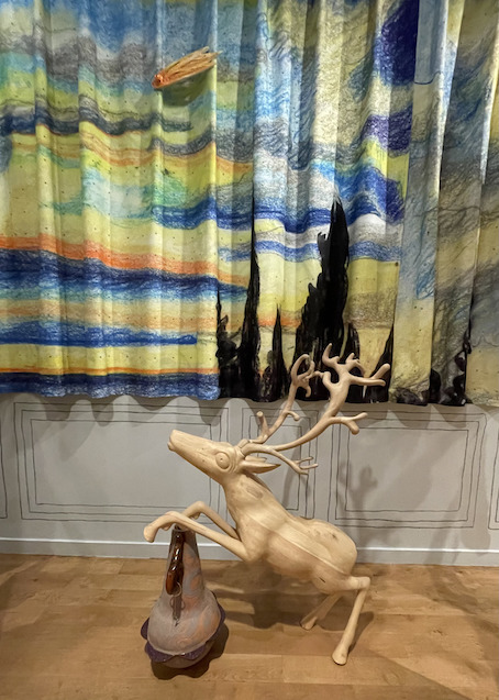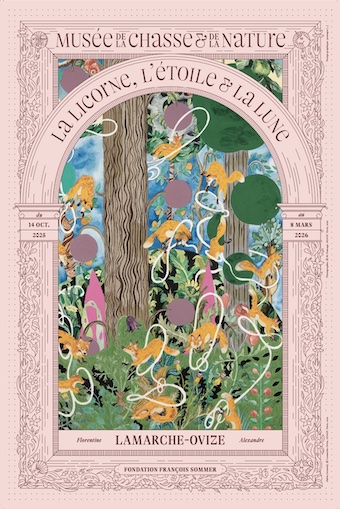 Le Musée de la Chasse et de la Nature consacre une exposition immersive au duo Florentine et Alexandre Lamarche-Ovize, La licorne, l’étoile et la lune, déployée du 14 octobre 2025 au 8 mars 2026. Les artistes transforment la salle d’exposition temporaire en un espace poétique à mi- chemin entre foret et intérieur domestique, entre l’art et artisanat oû humains et animaux cohabitent. Un « crépuscule crayonné » où dessins, tapisseries, estampes, paravents, céramiques, luminaires et animation composent un décor vivant, peuplé d’un bestiaire fantastique – paon, cerf, hibou, grenouille, chat, et autres créatures.