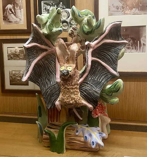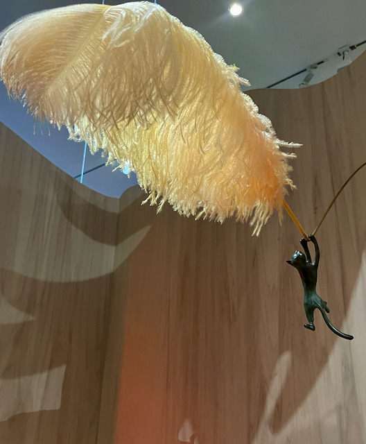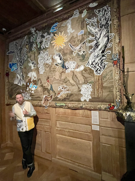 Cette installation théâtralisé de plus de 70 œuvres donc plus de la moitié inédites, investie non seulement la salle de l’exposition, mais aussi le parcours permanent du musée. Entre œuvres inédites, emprunts et pièces marquantes de leur carrière, les artistes investissent murs, mobilier et tapisseries, jouant avec les codes du lieu pour en proposer une relecture sensible. Ils revisitent les thématiques du musée – ornement, portrait, trophée, statuaire – et les détournent en compositions hybrides, parfois grotesques, qui interrogent notre rapport aux autres espèces.