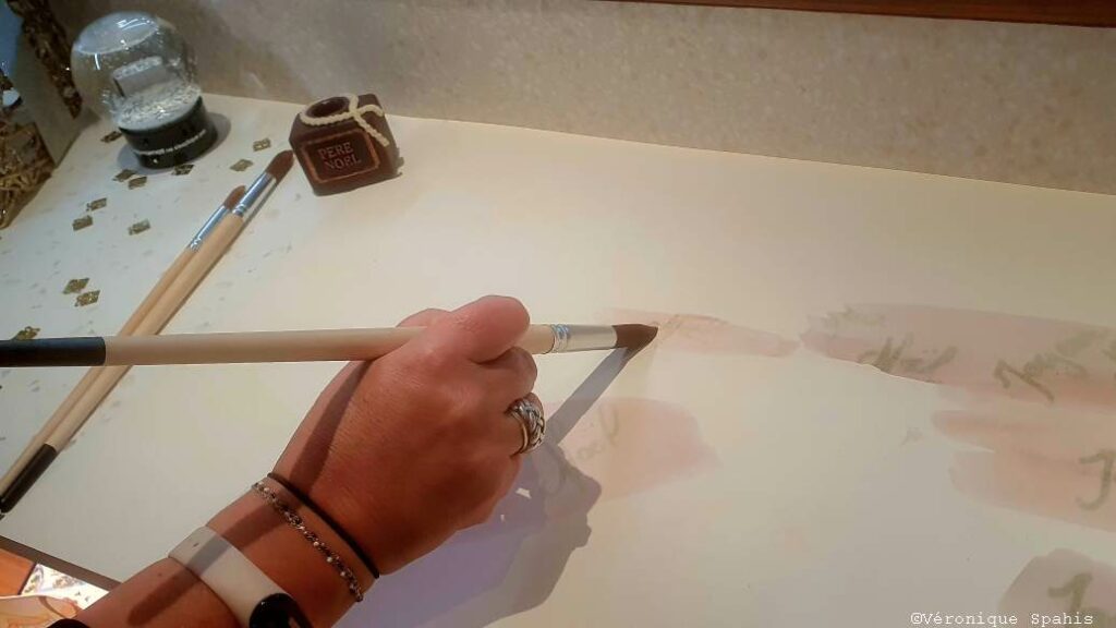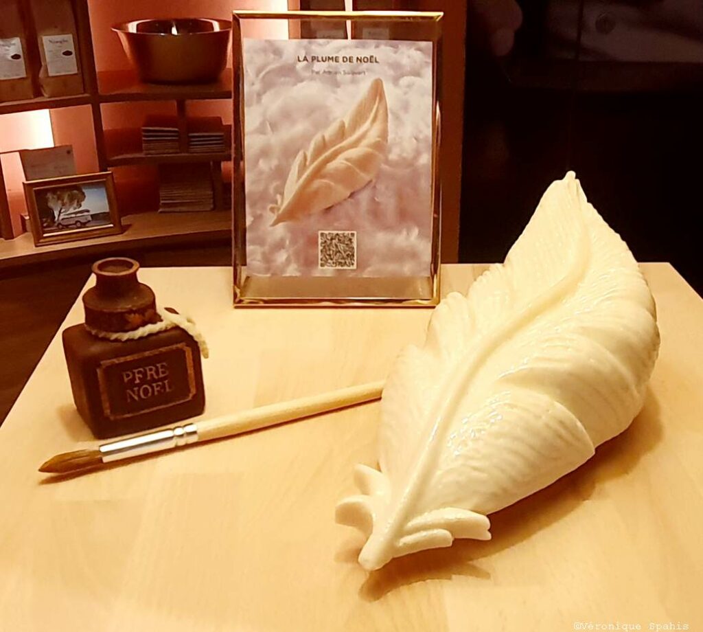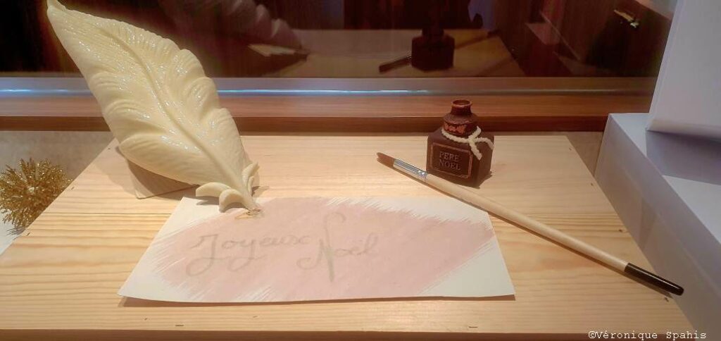 La bûche se présente comme une scène délicate : une plume immaculée, symbole de légèreté et clin d’œil au nom du restaurant, repose près d’un petit encrier de chocolat contenant du vin du Château Troplong Mondot qui fera apparaître un message secret signé du Père Noël. On dirait un instant suspendu, comme si le Père Noël s’était arrêté au domaine pour écrire l’une de ses célèbres lettres. L’objet est raffiné, expressif, et joue subtilement sur la frontière entre conte et gastronomie.