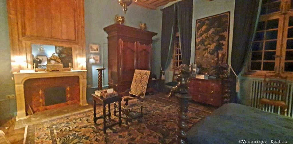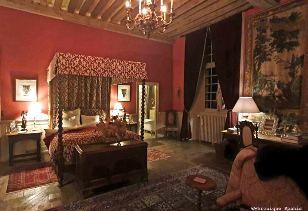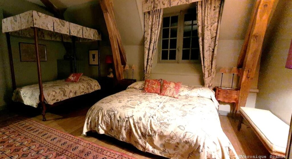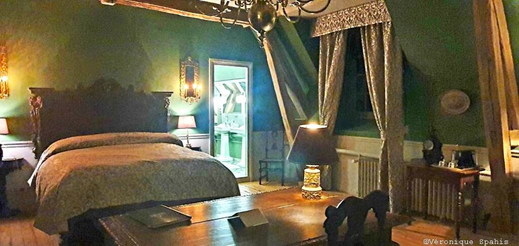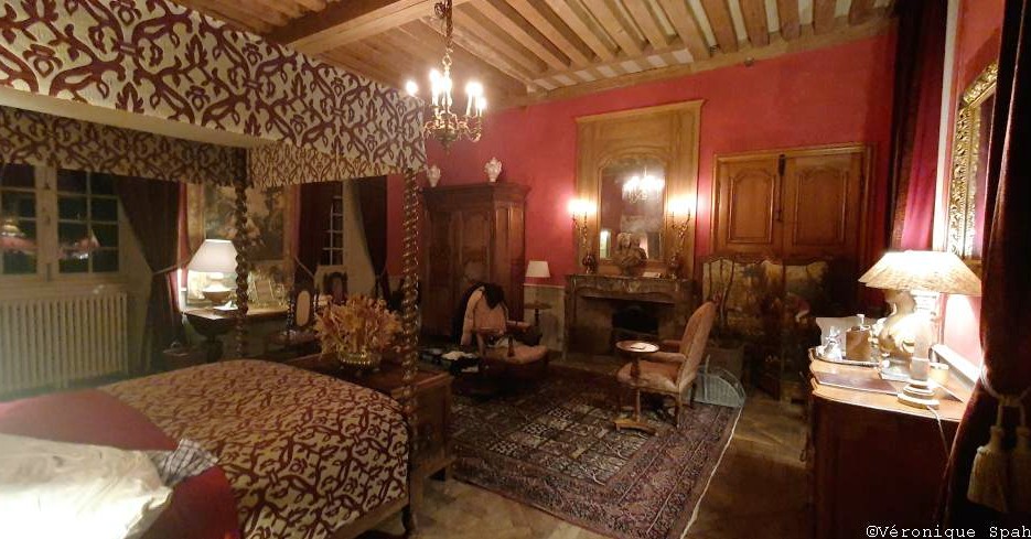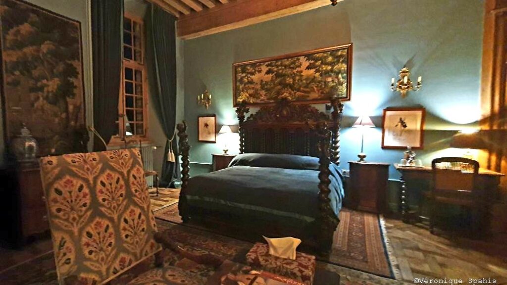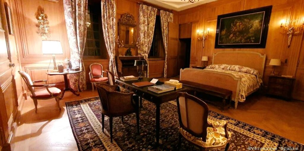 Chaque chambre (tout comme le reste des pièces du château) est meublée avec raffinement, en tenant compte de l’histoire de chacune – du mobilier en bois et des objets chinés avec soin – issus de recherches historiques – des tableaux et des sculptures, une literie haut de gamme, des livres… (de 210€ à 360€ la nuit, petit-déjeuner gourmand inclus)
