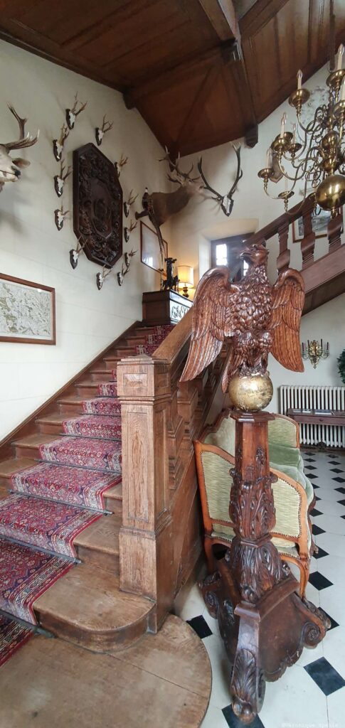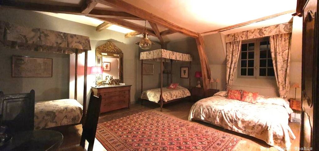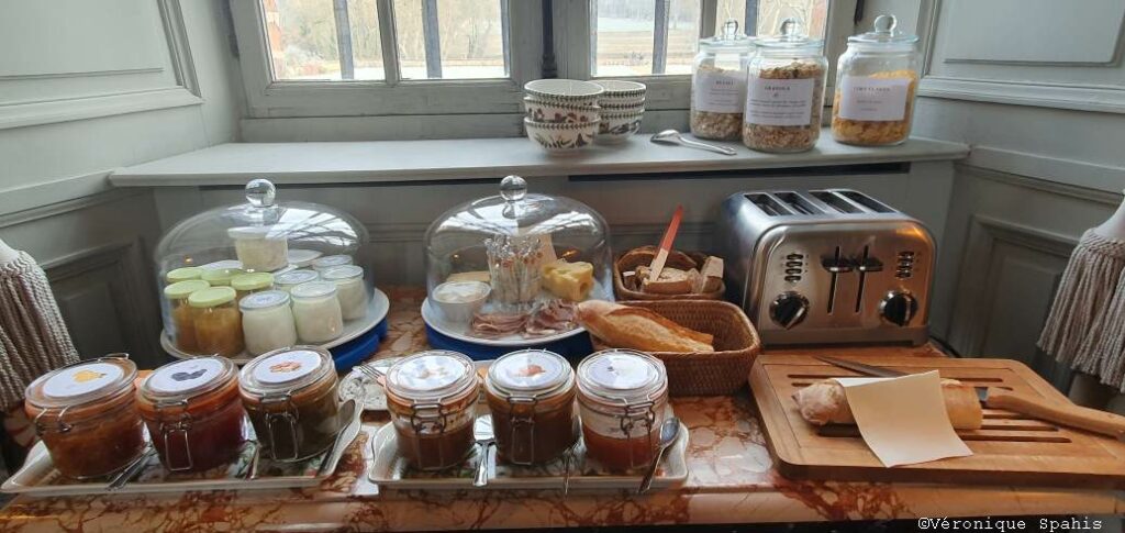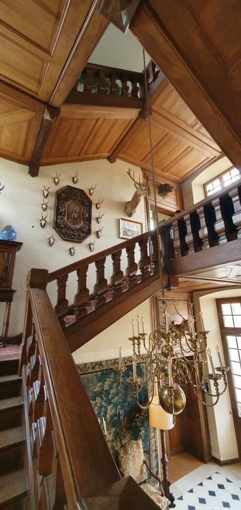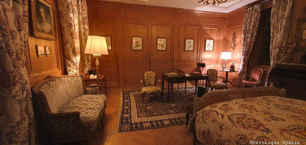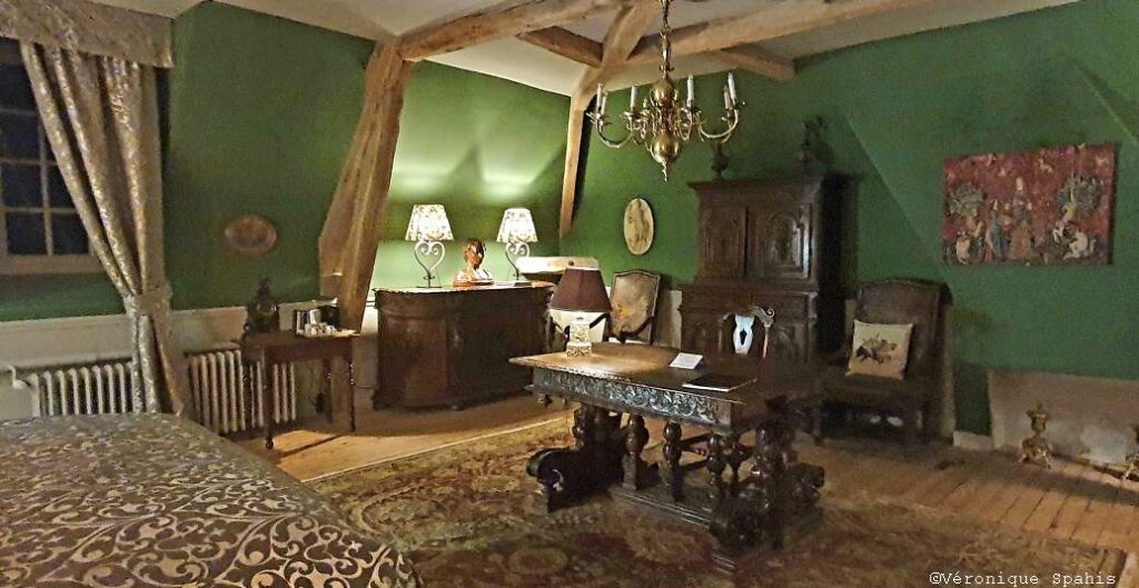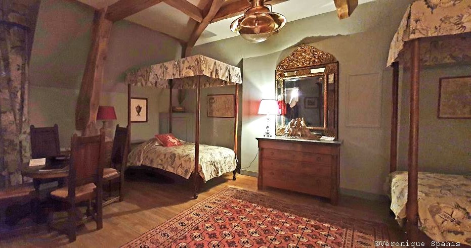 Chaque chambre (tout comme le reste des pièces du château) est meublée avec raffinement, en tenant compte de l’histoire de chacune – du mobilier en bois et des objets chinés avec soin – issus de recherches historiques – des tableaux et des sculptures, une literie haut de gamme, des livres… (de 210€ à 360€ la nuit, petit-déjeuner gourmand inclus)