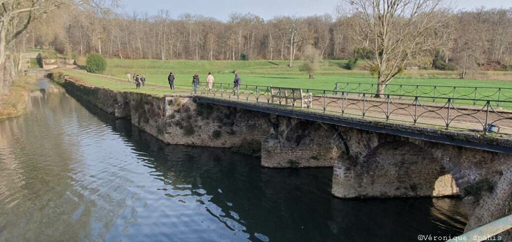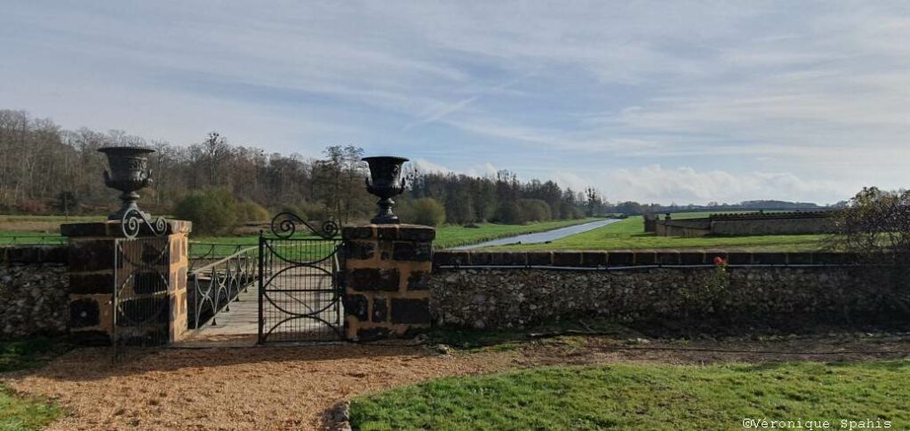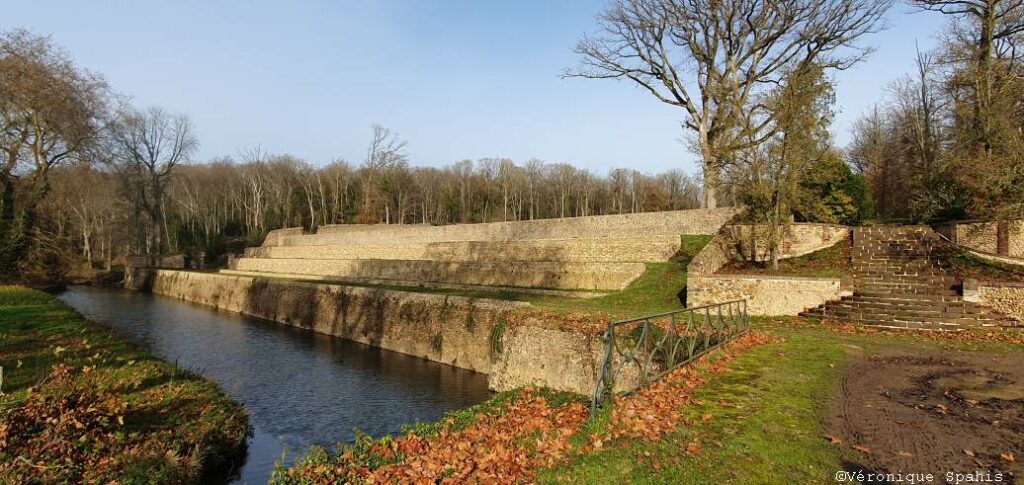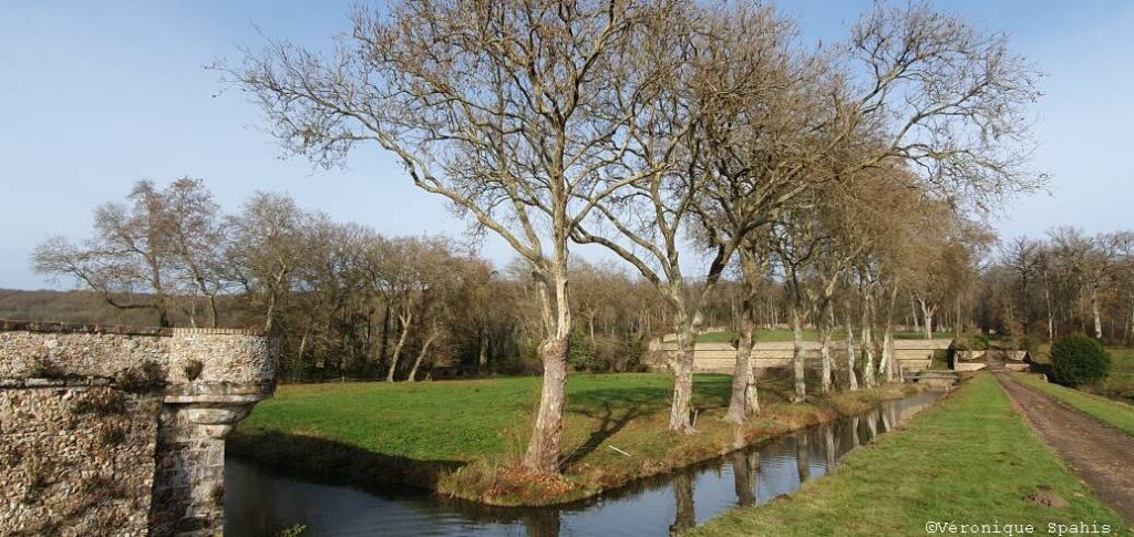 Dans le domaine, on reconnaît encore : les relais d’anciens canaux, des levées de terre destinées à guider l’eau, des rigoles qui ne servaient plus à la seule décoration, des “îles” séparées par des bras d’eau qui devaient un jour rejoindre un canal bien plus large.