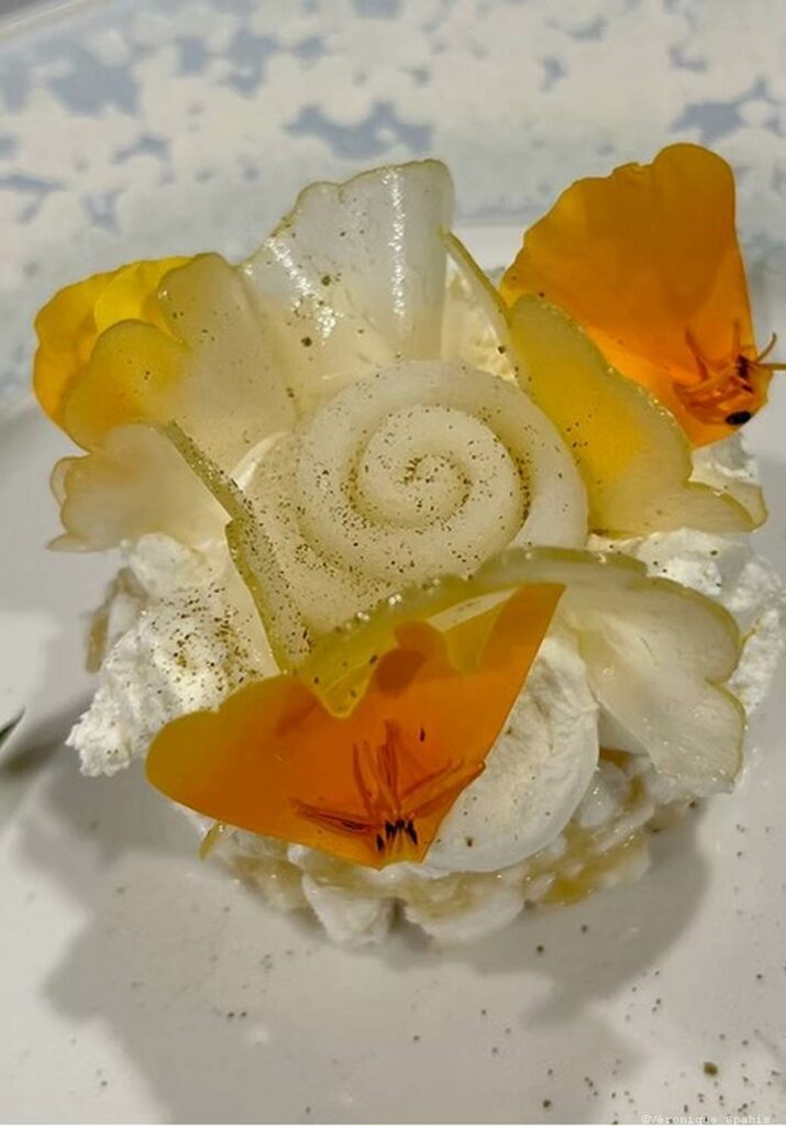 Le repas prend la forme d’un menu en quatre temps, entièrement imaginé par la cheffe selon les arrivages du moment. On ne choisit pas (mais la cheffe tient compte des intolérances alimentaires précisées lors de la réservation) : on se laisse porter. C’est tout le charme de l’expérience.