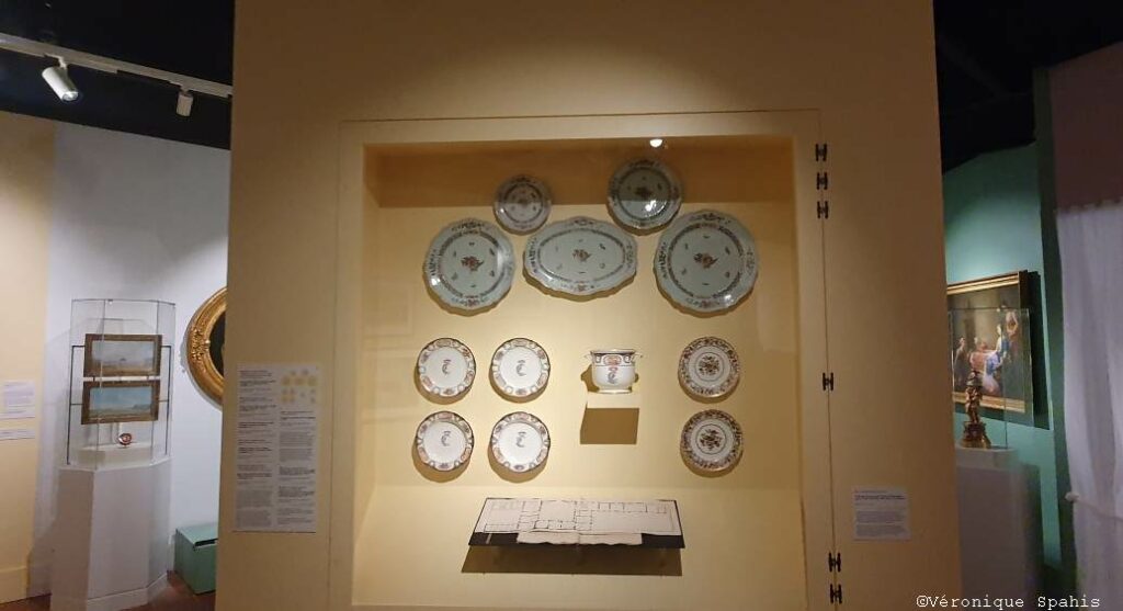 Les arts décoratifs occupent une place essentielle dans le parcours, notamment avec un ensemble de porcelaines de la Compagnie des Indes aux armes du duc d’Aiguillon, réalisé dans les ateliers chinois au milieu du XVIIIᵉ siècle. Ces pièces illustrent l’ouverture du monde aristocratique aux échanges internationaux et le goût pour les productions extrême-orientales, adaptées aux codes héraldiques européens. Leur présence permet d’aborder les liens entre commerce maritime, prestige social et culture matérielle.