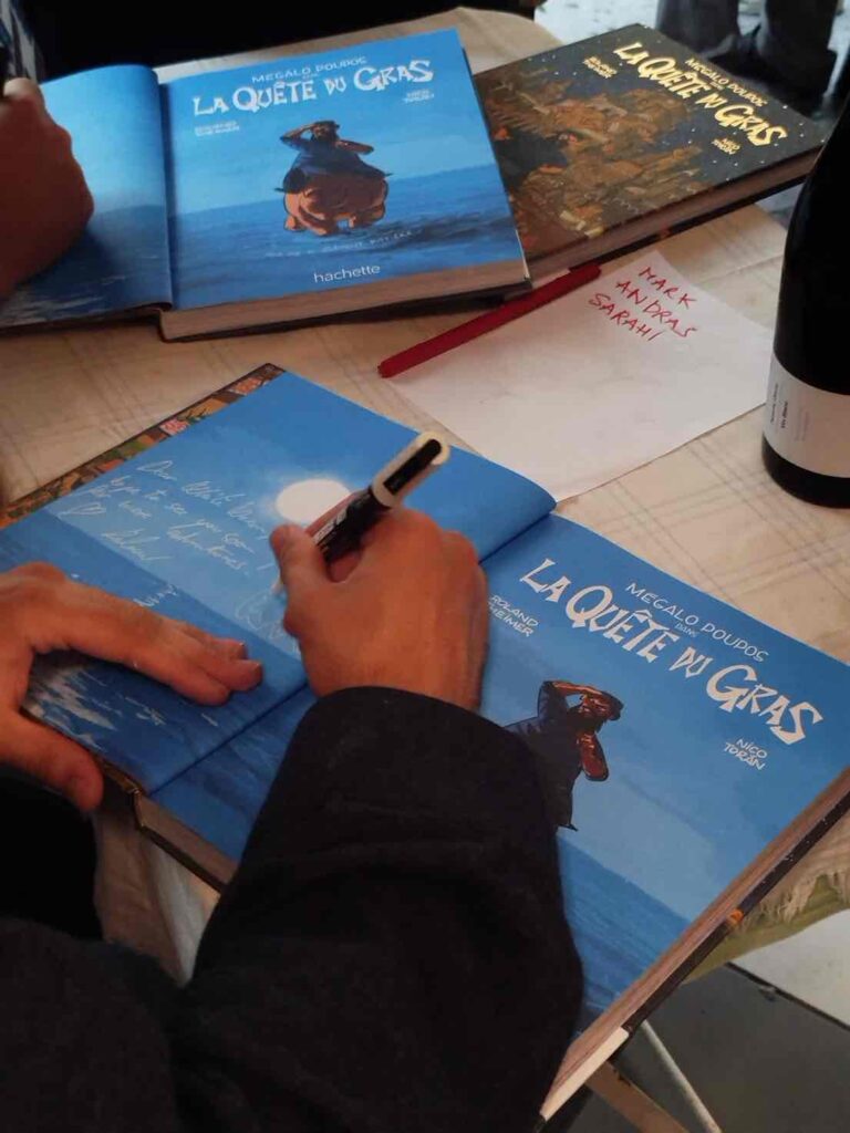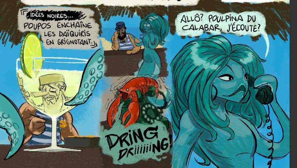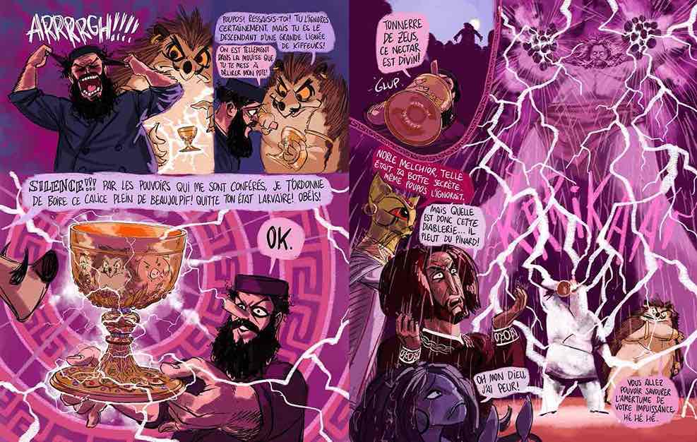 Impossible de s’ennuyer à la lecture de Mégalo Poupos dans la quête du gras. La bande dessinée allie clins d’œil mythologiques et personnages improbables. De Poulpina, barmaid mi-femme mi-pieuvre à Mortabelle, le cochon-taxi animal de compagnie, en passant par Lulu, le poulpe banquier, c’est un univers extravagant et rocambolesque que propose les deux amis à leurs lecteurs.