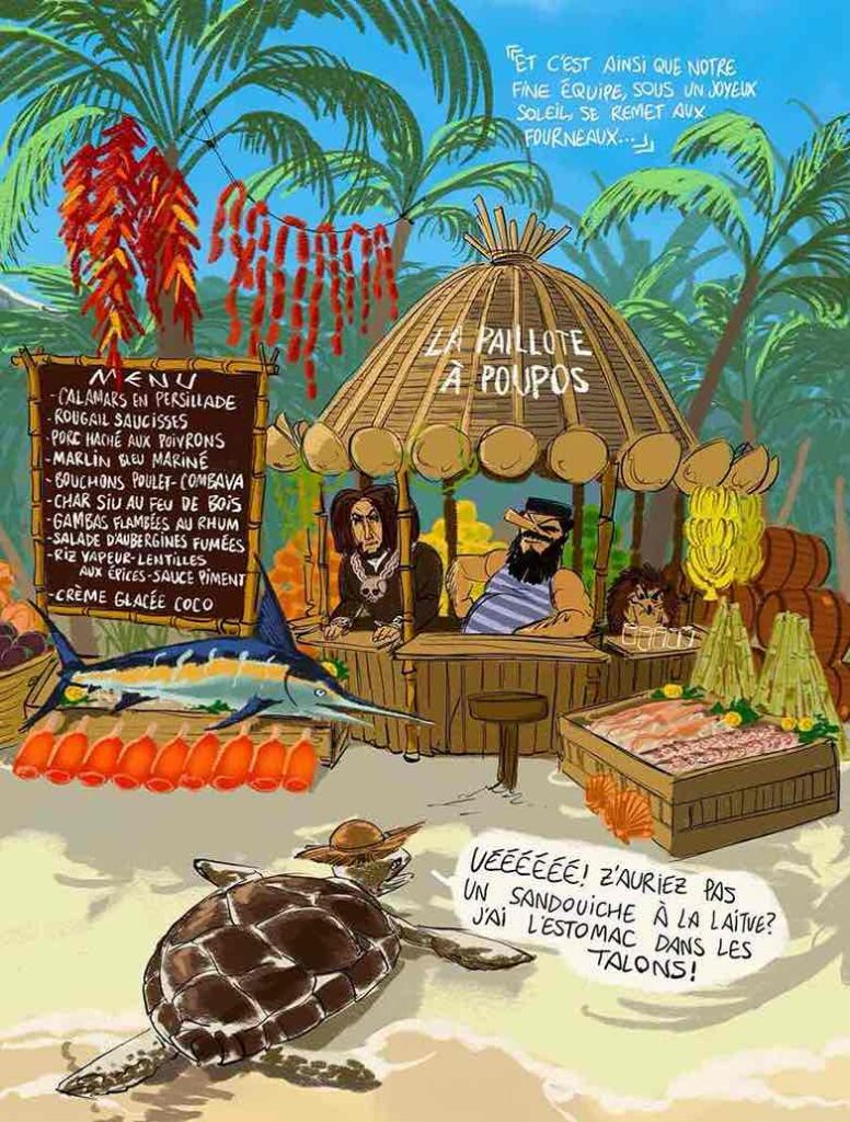 Une idée du chef, née il y a deux ans, qui trouve finalement un aboutissement grâce à cette collaboration. Pour Nicolas Torán, le défi était de taille : donner corps à un univers tout droit sorti de l’imagination bouillonnante de Roland Theimer. Pari pleinement réussi, car son trait a su amplifier la folie créative du chef et donner à ce monde une dimension encore plus délirante que prévu selon Roland Theimer.