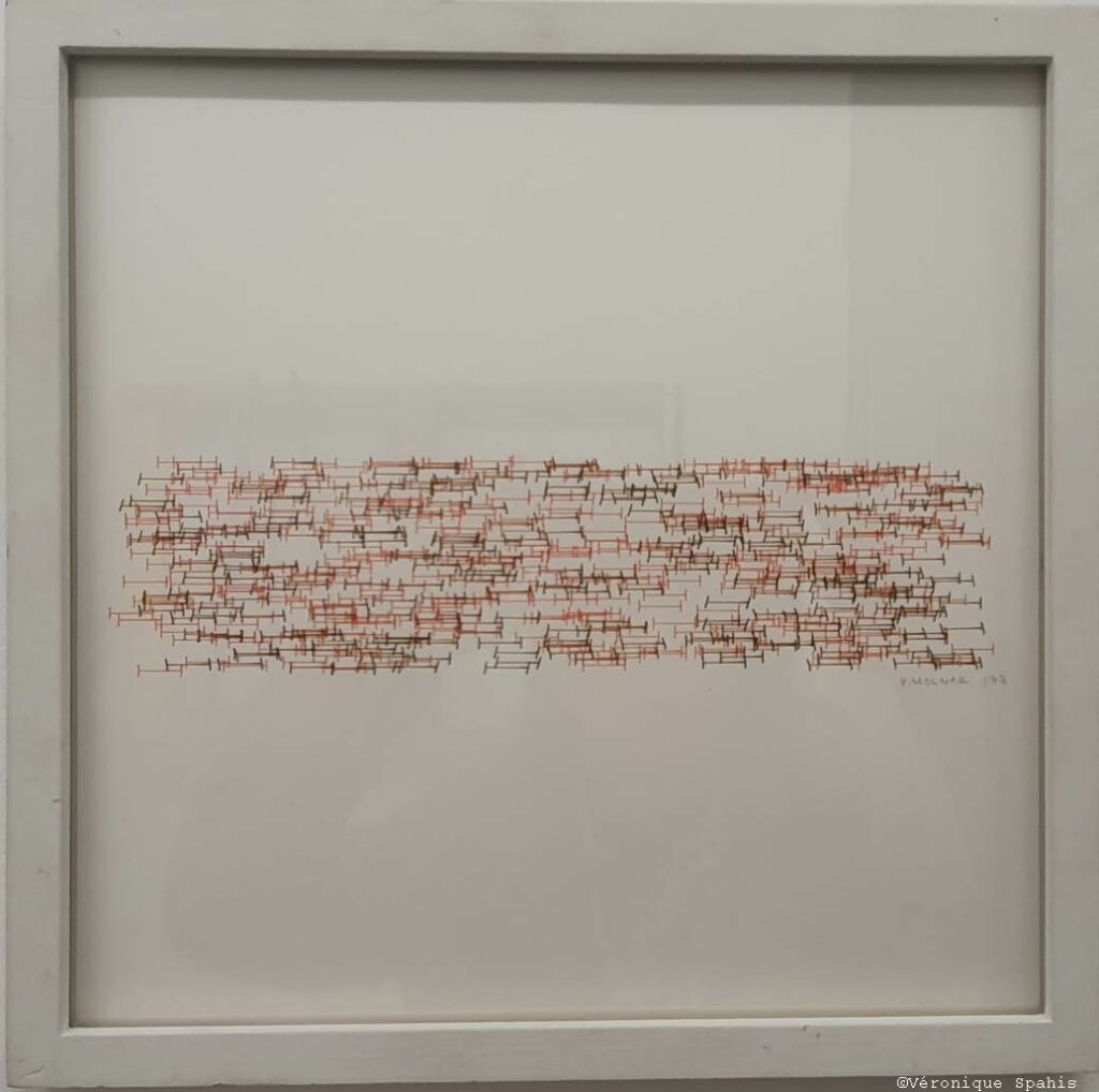 Vera Molnar — Le hasard programmé. Vera Molnar (1924–2023) est une pionnière absolue : dès les années 1960, elle explore les potentialités de la machine comme partenaire créatif. Elle invente des « règles » — des algorithmes visuels — qu’elle confie à l’ordinateur pour générer des formes, puis les confronte à son propre regard. Ce dialogue entre hasard programmé et décision humaine crée une peinture d’une précision vibrante. Ses œuvres, souvent fondées sur des séries de lignes, de carrés ou de grilles perturbées, révèlent la beauté qui naît de la tension entre ordre et accident.