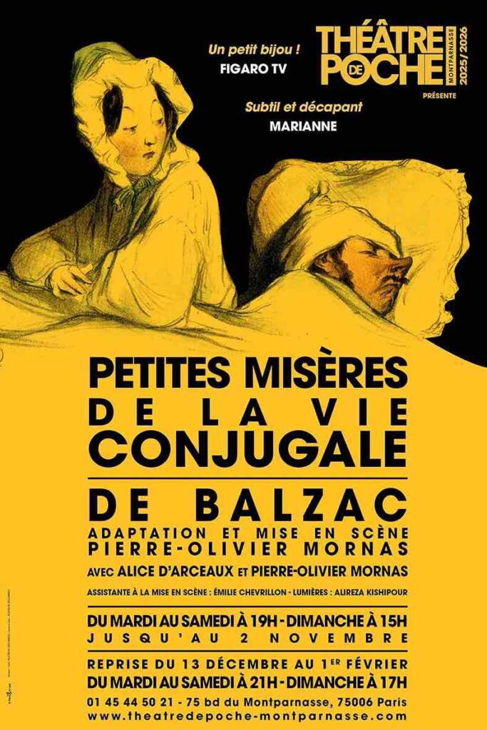 Le spectacle, construit comme une série de tableaux tirés de l’ouvrage de Balzac, explore avec humour et lucidité les différentes étapes de la vie à deux : le romantisme des débuts, la routine du quotidien et l’arrivée d’un enfant… Tout y passe : des petites vexations aux compromis, des piques aux maladresses, des soupirs exaspérés d’un matin pressé, aux jalousies déclenchées par un simple regard, d’une belle-mère envahissante à un mot de trop lancé par orgueil et d’un dîner mondain qui dérape à une réconciliation sur l’oreiller. Toutes ces “petites misères”, à la fois drôles et universelles, se muent en autant de miroirs où chacun reconnaît ses propres travers amoureux.