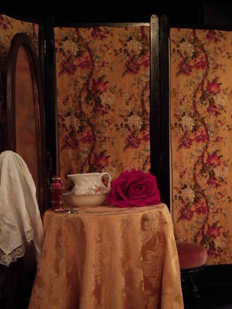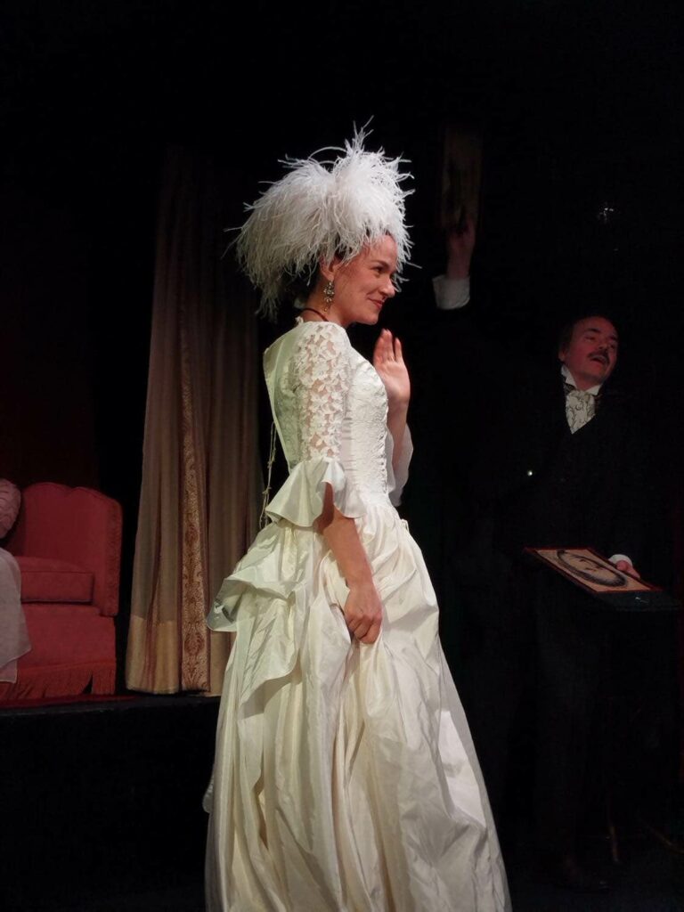 Le décor, véritable petit écrin de théâtre, allie velours rouge, paravent, coiffeuse d’époque et sofa à pampilles. Loin d’être figé, il devient un espace vivant, animé par les comédiens qui en exploitent chaque recoin. Le spectateur se laisse emporter, comme invité chez eux, témoin des querelles et des réconciliations d’un couple qui devient très vite universel. Entre robes à plumes, queue-de-pie et haut-de-forme, tout brille de raffinement et de théâtralité, et c’est ce contraste entre l’élégance affichée et le désordre du couple qui rend chaque scène d’autant plus drôle et familière.