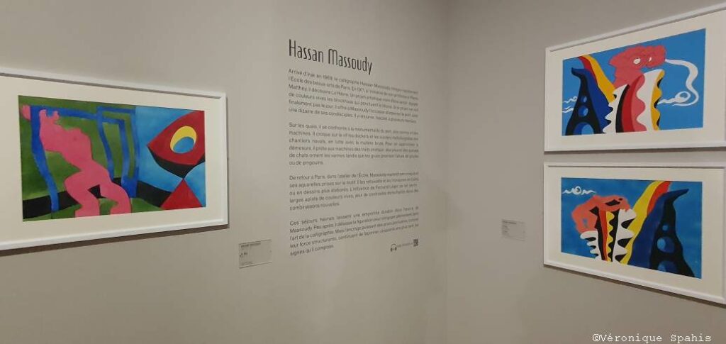 En 2024 et2025, Hassan Massoudy, calligraphe d’origine irakienne, offre au MuMa près de300œuvres exécutées alors qu’il était étudiant aux Beaux-Arts de Paris. Ses courts séjours au Havre pendant les années70 lui permettent de découvrir les espaces portuaires qui marquent sa mémoire d’artiste de manière indélébile. Il décrit ainsi son travail de cette époque : « … Tous ces morceaux de ferraille, proues de cargo, grosses chaînes, amarres, tuyaux qui serpentent, enchevêtrements de câbles, vannes, se transforment et prennent vie. Les grues deviennent girafes, les véhicules de manutention deviennent crabes aux larges pinces, les vannes acquièrent des yeux et parfois un sourire. Tout est sombre, noir ou rouille, alors je colore de rouge, de bleu, de jaune, de vert, en aplats de couleurs inspirés de Fernand Léger… ».