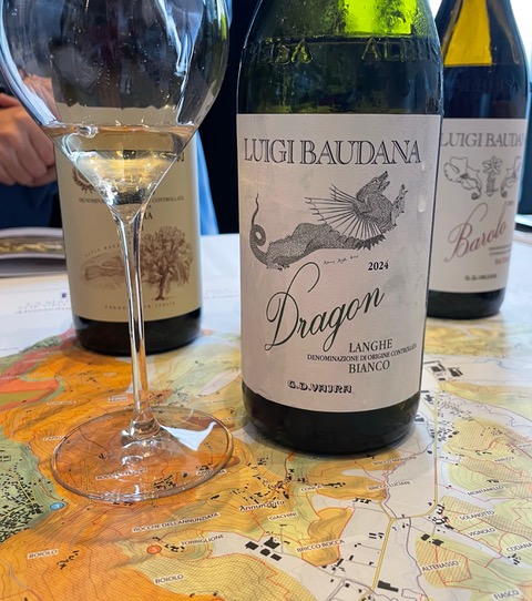 Luigi Baudana propose aussi un vin blanc à la jolie robe jaune paille, avec des reflets verdâtres. La fraicheur et l’onctuosité du Langhe Bianco Dragon 2024 sont le résultat d’un assemblage, réussi bien qu’inhabituel dans le Piémont, de 56% Chardonnay, 18% Nascetta, 18% Sauvignon Blanc et 8% Riesling. Il combine toutes les qualités de ces cépages : un nez d’herbes fleuries et d’agrumes, une bouche d’une belle acidité, avec une finale saline et des saveurs de pomme, de fleurs et de miel.