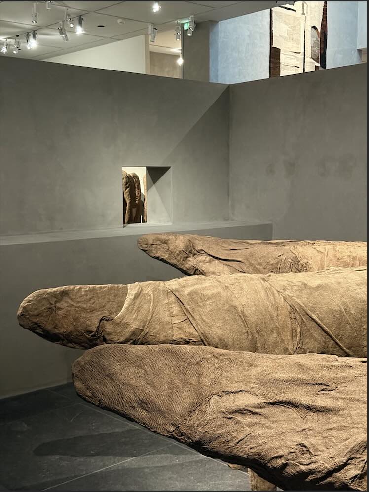 Le parcours souligne la rapidité de l’évolution stylistique d’Abakanowicz. À partir des années 1970, l’artiste se tourne vers la figure humaine, la fragmente, la duplique. Sa série des Dos (1978-1980) s’affirme comme une critique de l’uniformisation du collectif, propre à l’idéologie communiste ambiante : coques identiques mais subtilement différenciées, corps vidés, soumis au moule. Plus tard, les Figures dansantes (1990) prennent forme dans une tension presque rituelle, héritée du butô découvert par l’artiste au Japon. Quant aux Foules (1995-1997), elles déploient l’inquiétude de l’anonymat tout en rappelant que chaque corps, malgré la masse, garde une singularité.