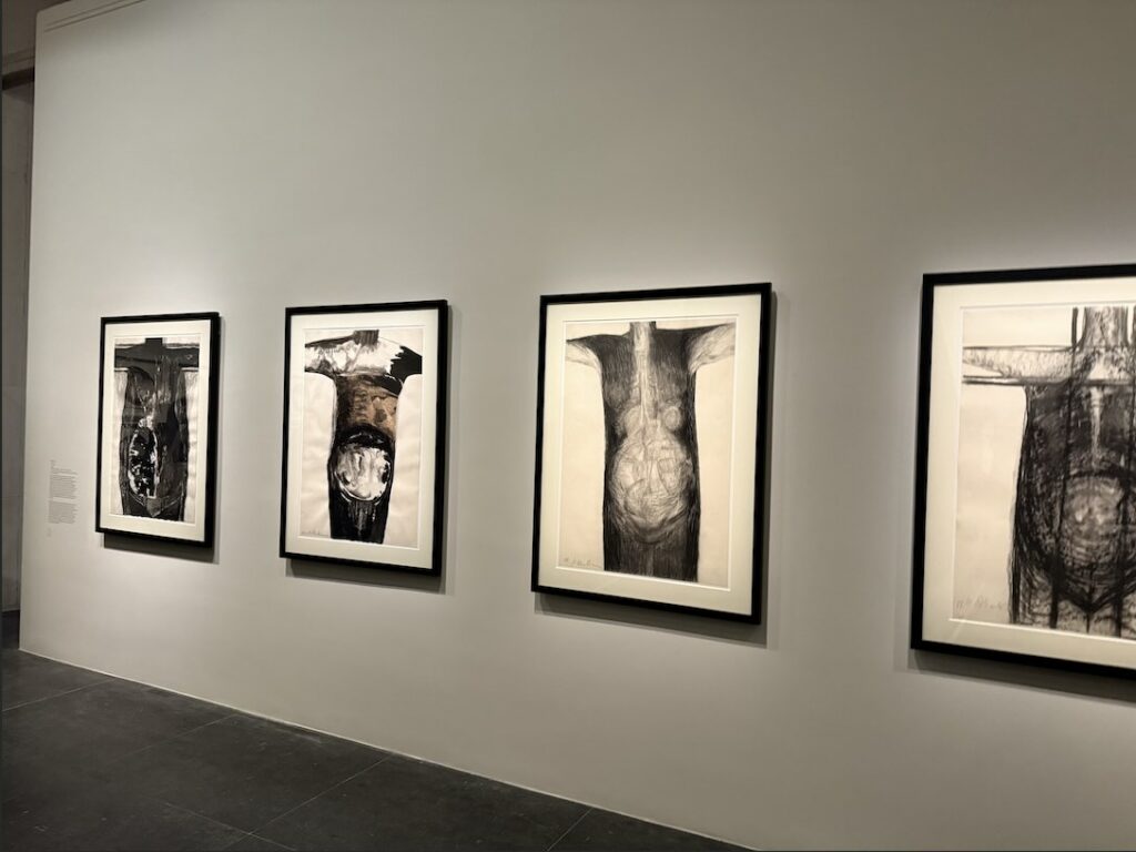 L’exposition évoque également son rapport intime à la nature, notamment dans les Mutants (1994-1996), créatures énigmatiques à l’apparence animale, et dans la série des Mouches (1993), où elle élève un insecte mort au rang de motif monumental, fascinée par les structures du vivant. En contrepoint, ses dessins –lavis, encres noires, fusains – semblent sonder le corps de l’intérieur, évoquant tour à tour cellules, tissus et autres IRM imaginaires.