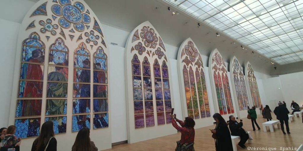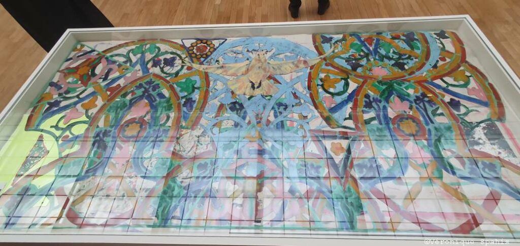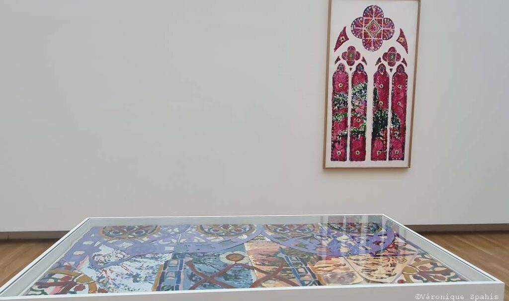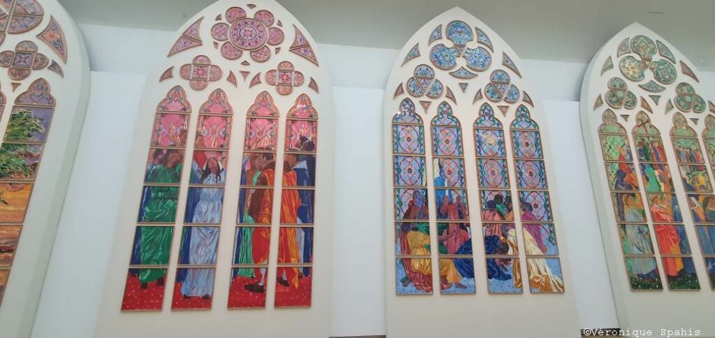 Dans une autre salle du Grand Palais, Claire Tabouret présente D’un seul souffle, une exposition intimement liée à un contexte spécifique. En décembre 2024, Claire Tabouret, en association avec l’atelier Simon-Marq, a été désignée lauréate de la consultation engagée par le ministère de la Culture pour la création de vitraux contemporains pour Notre-Dame de Paris. Depuis cette date, Claire Tabouret s’est attelée à la réalisation de maquettes grandeur nature pour les six baies du bas-côté sud de la nef de Notre-Dame.