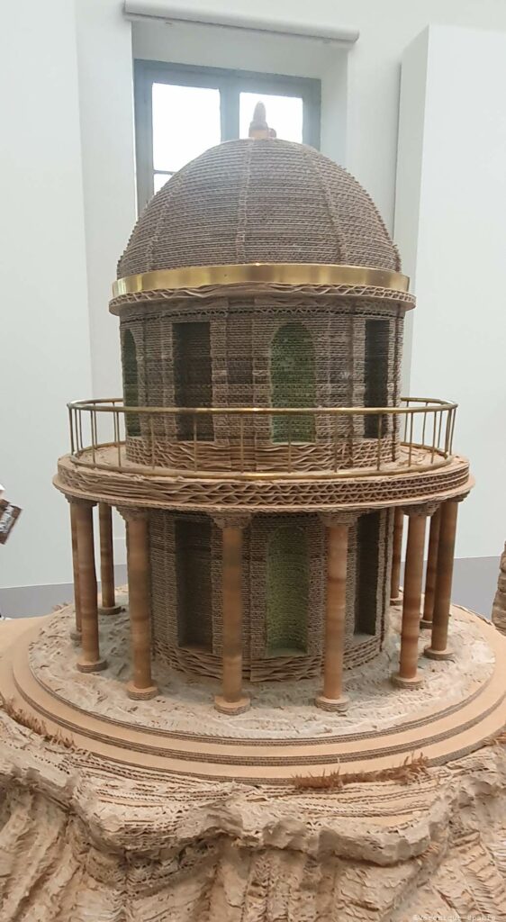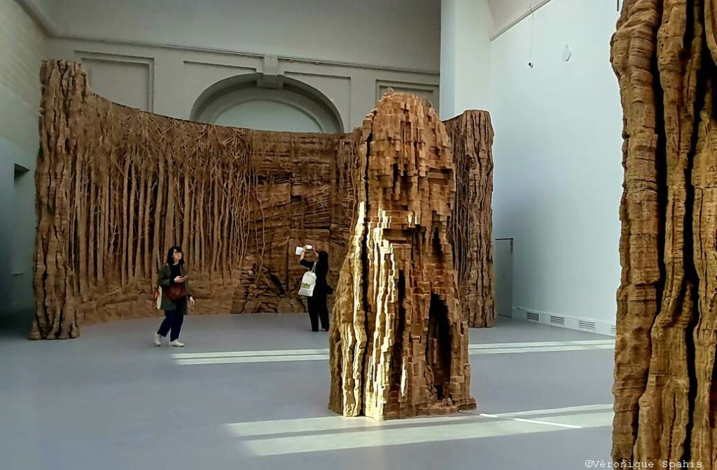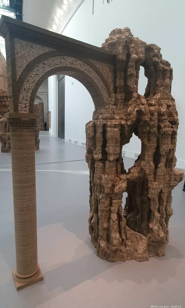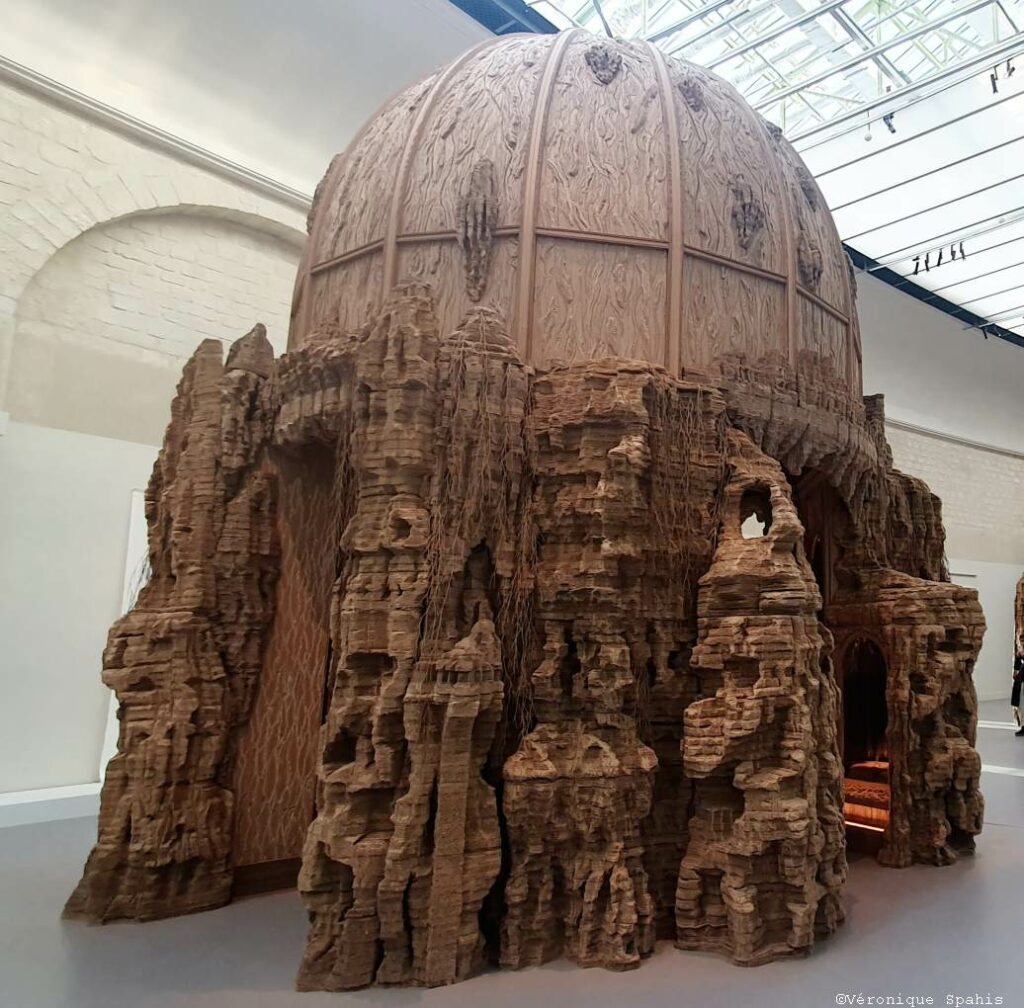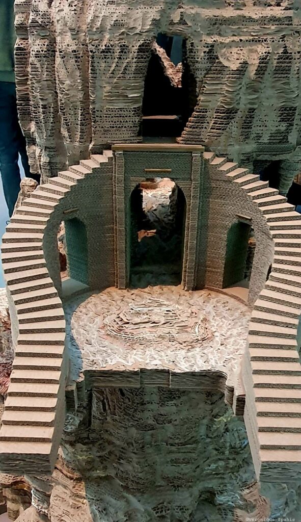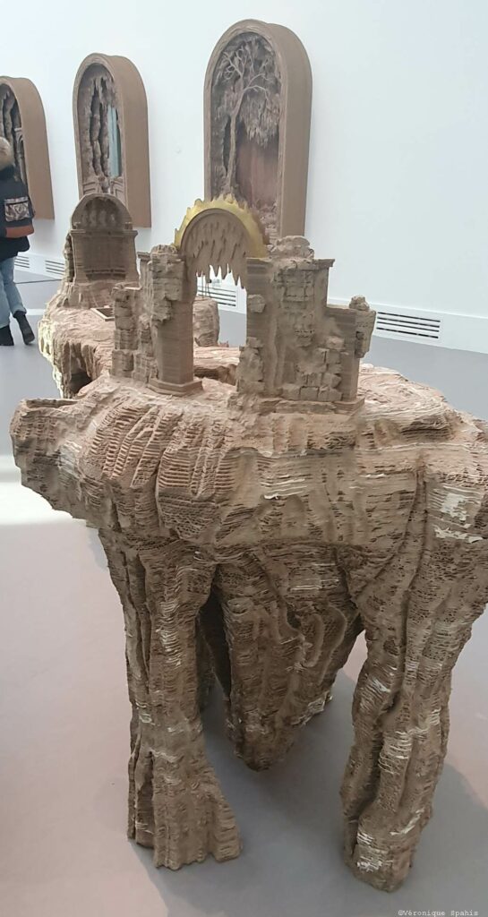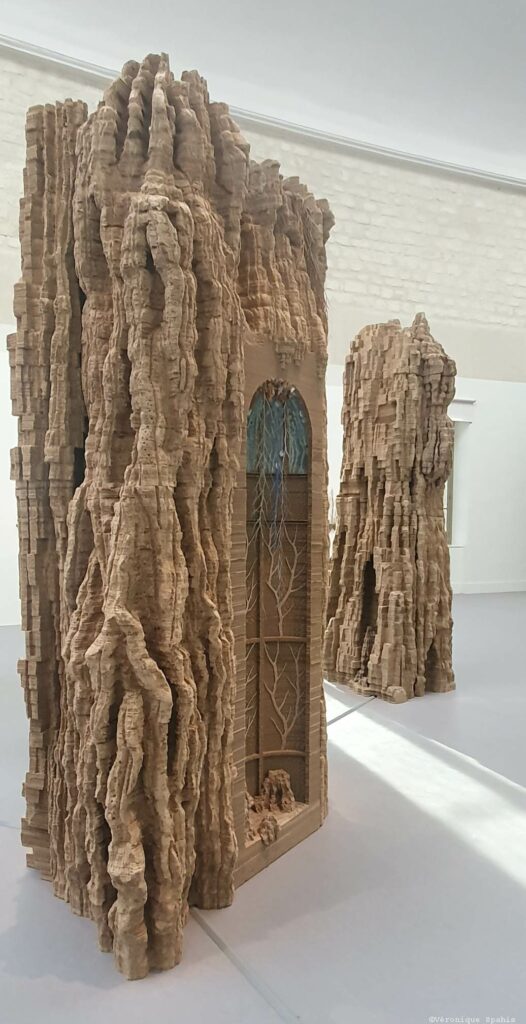Les sculptures et installations composent un paysage continu, fait de reliefs, de cavités et de masses végétales ou minérales. Le carton, travaillé par couches, devient une matière dense, presque tellurique. Le parcours impose ses propres règles : avancer, contourner, revenir en arrière. Un point de vue n’en annule jamais un autre ; au contraire, chaque déplacement transforme la perception. Ce qui semblait structure se dissout, ce qui paraissait décoratif devient porteur d’une force archaïque.