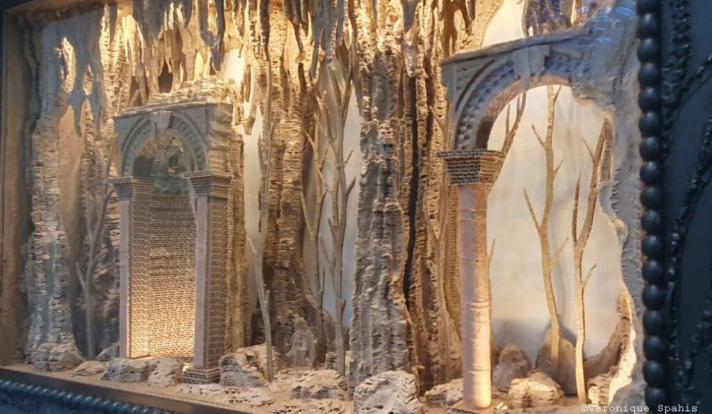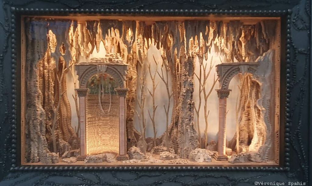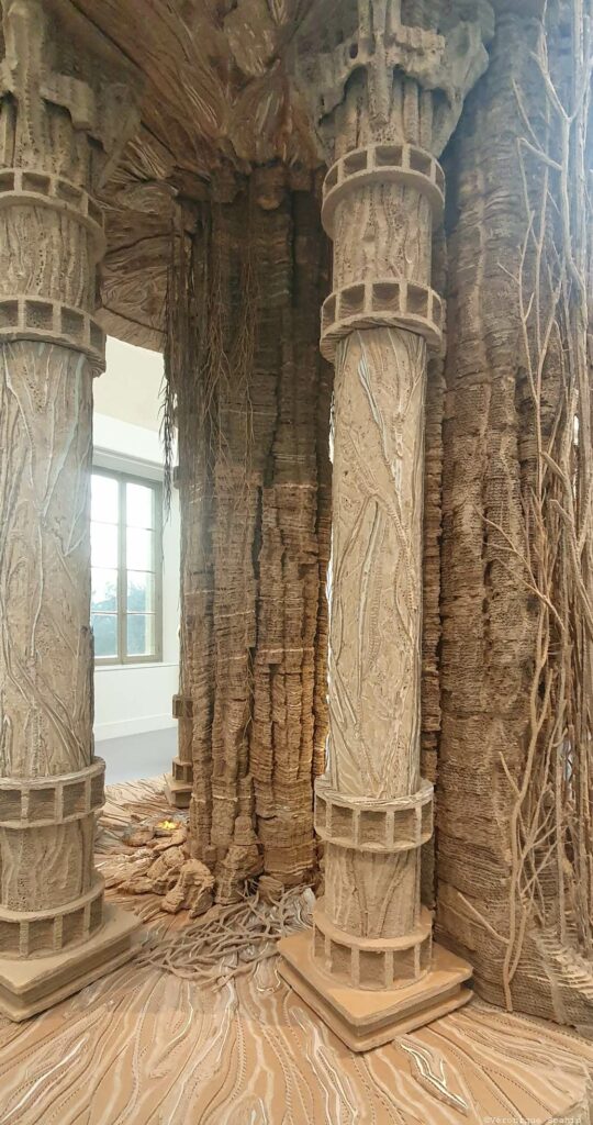 Dans la salle qu’elle investit, Eva Jospin conçoit Grottesco comme un espace à traverser plutôt qu’un ensemble d’œuvres à contempler frontalement. Le titre, emprunté à l’imaginaire de la grotte et à l’émergence d’un langage ornemental né de la découverte de décors enfouis, annonce un monde où les frontières se brouillent : entre nature et architecture, entre intérieur et extérieur, entre passé et invention.