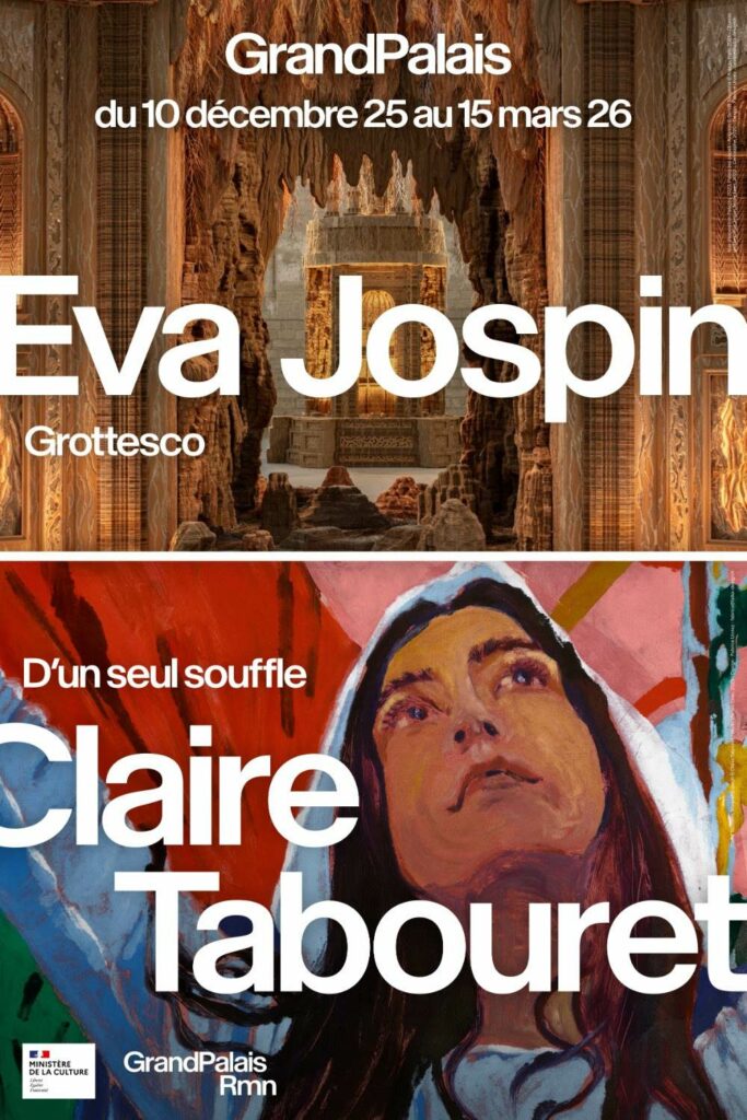 Au Grand Palais, deux expositions se déploient simultanément, chacune dans sa propre salle, en vis-à-vis, chacune portée par une artiste invitée à investir pleinement l’espace qui lui est confié. D’un côté, Grottesco d’Eva Jospin propose une immersion dense et labyrinthique dans un monde sculpté. De l’autre, D’un seul souffle de Claire Tabouret ouvre les portes d’un projet en devenir, lié à la création de vitraux contemporains destinés à la cathédrale Notre-Dame de Paris. Deux propositions autonomes, deux titres chargés de sens, réunies par une même exigence de lenteur, de précision et de dialogue avec l’histoire.